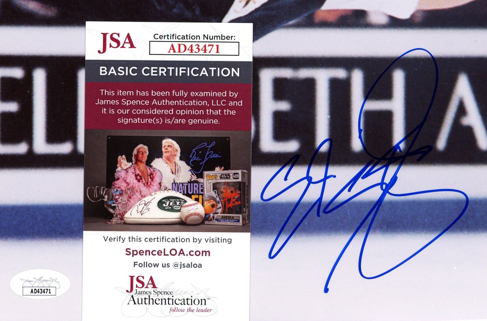 Offered is an Elvis Stojko Autographed 8x10 Photo Olympic Canada Figure Skating. This photo is authenticated by JSA and includes their Tamper-proof Sticker and Certificate of Authenticity.
