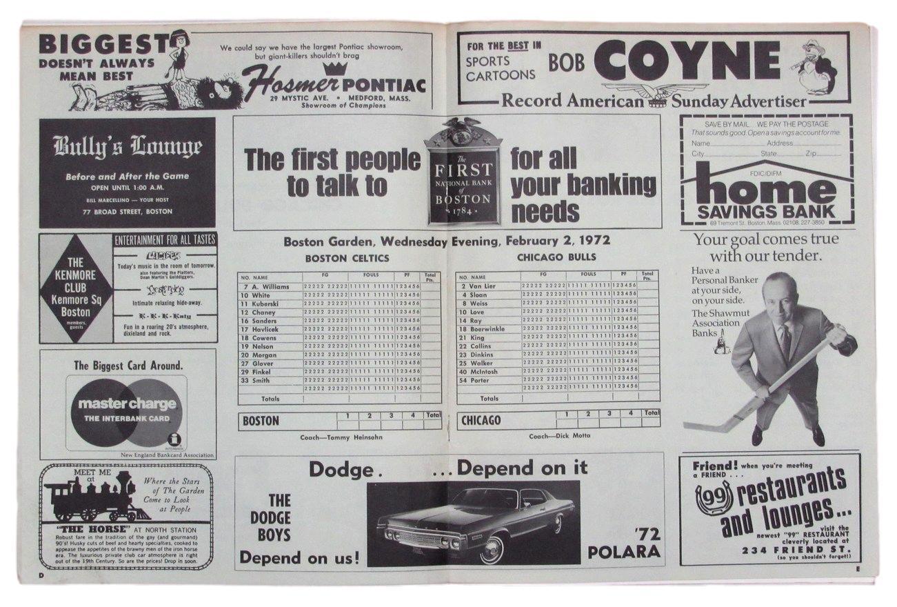 February 2, 1972 Boston Celtics vs. Chicago Bulls Boston Garden Program
