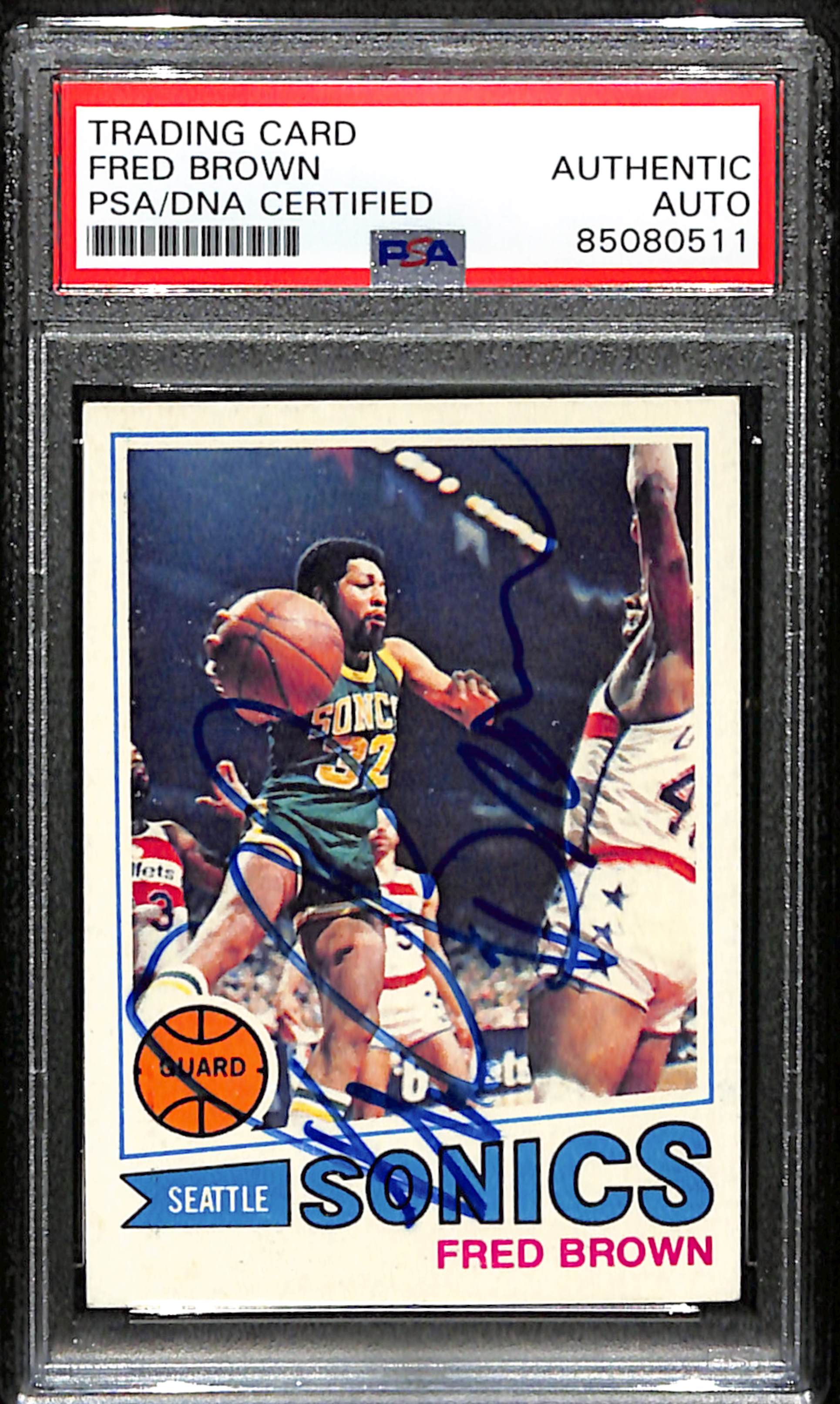Offered is a Fred Brown Signed 1977 Topps Card #30 Seattle Super Sonics. This Card is authenticated by PSA/DNA and is encapsulated in their tamper-proof plastic case.