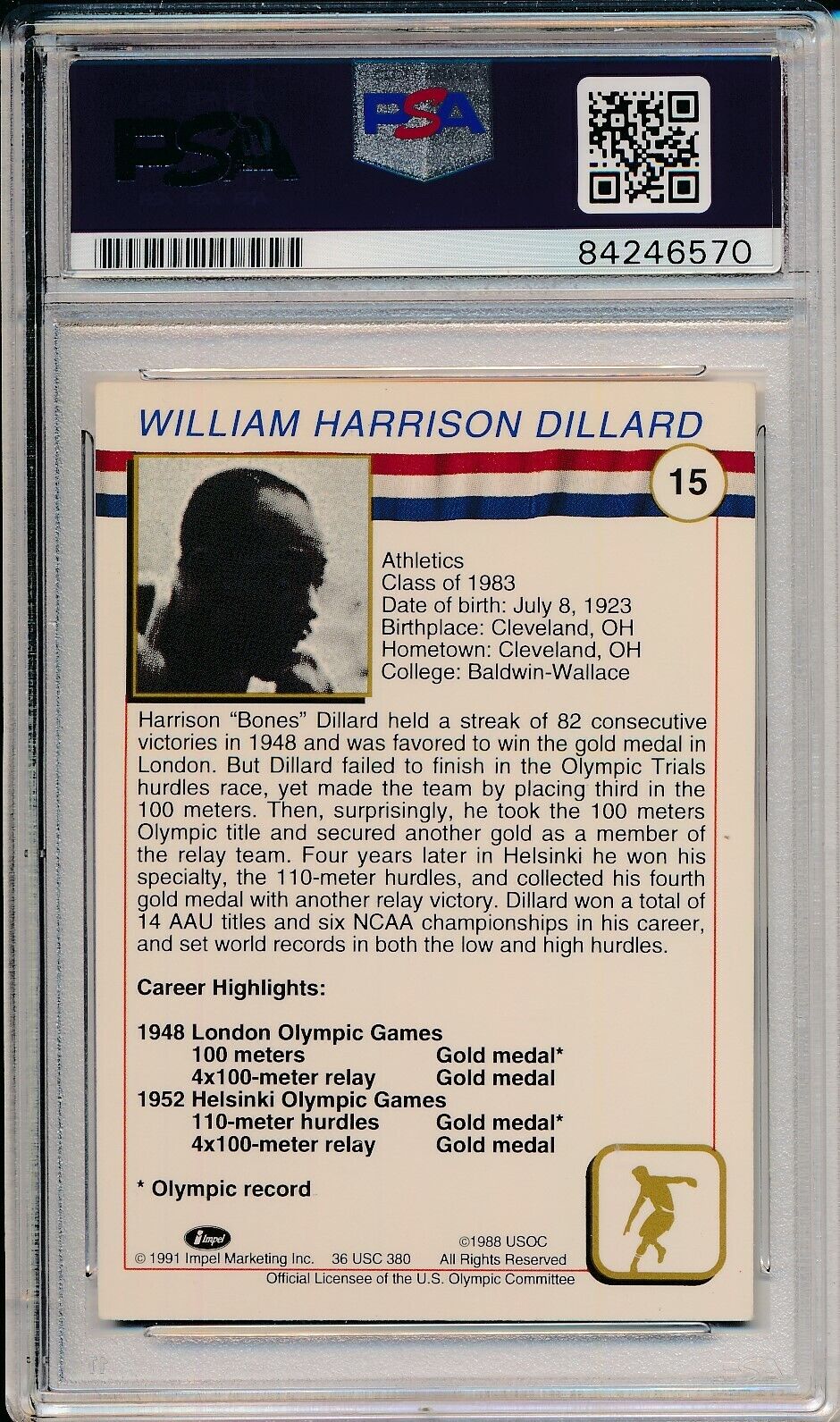 Harrison Dillard USA Olympic HOF Signed 1991 Impel Card #15 PSA/DNA 155276