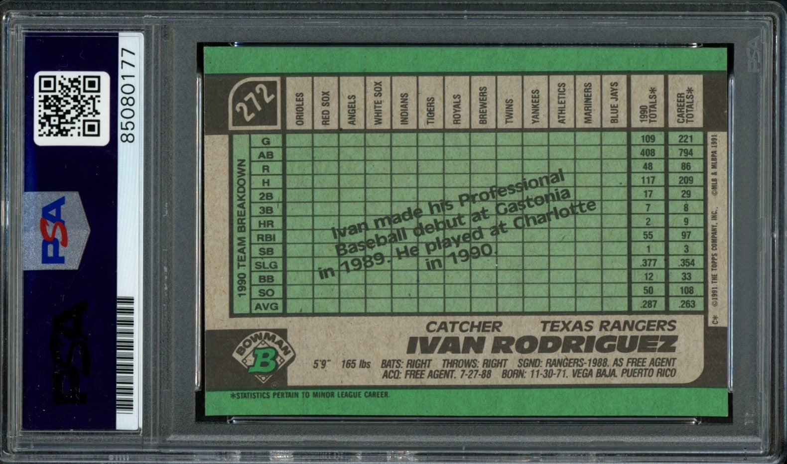 Ivan Rodriguez HOF Autographed 1991 Bowman Rookie Card #272 Rangers PSA/DNA 3