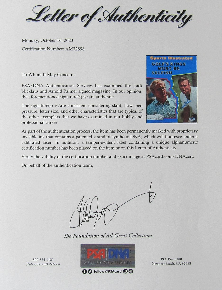 Offered is a Jack Nicklaus/Arnold Palmer Dual-Signed June 1, 1970 Sports Illustrated Magazine. This magazine is authenticated by PSA/DNA and includes their tamper-proof sticker and Letter of Authenticity.