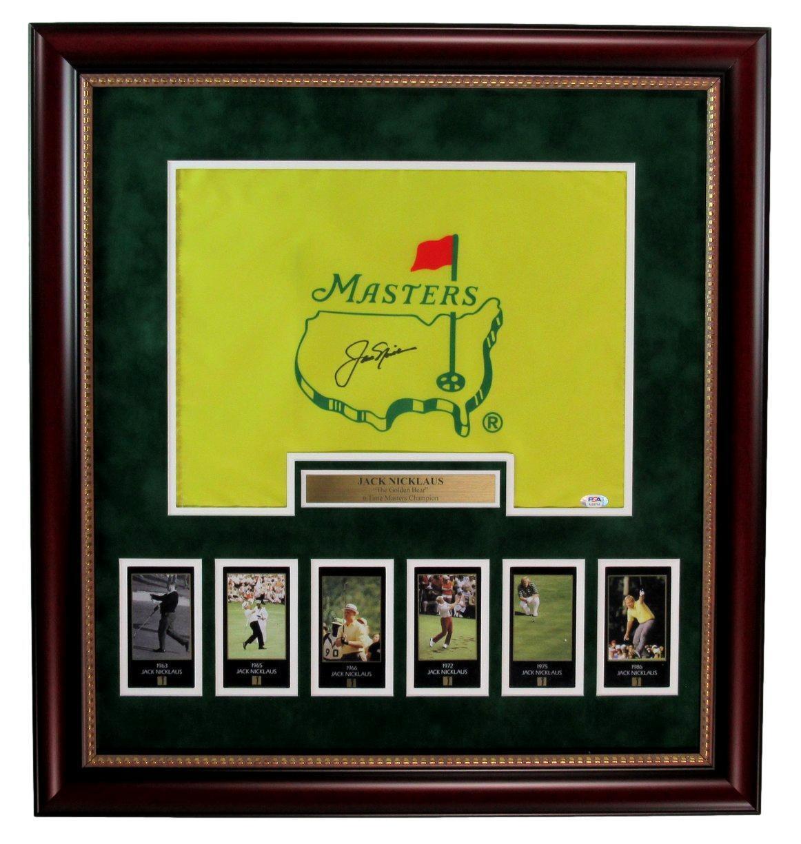 Offered is a Jack Nicklaus Autographed Masters Pin Flag with Trading Card Collage Framed. The outer frame size is 26 inches x 28 inches. This flag is authenticated by PSA/DNA and includes their Tamper-proof Hologram Sticker and Letter of Authenticity.