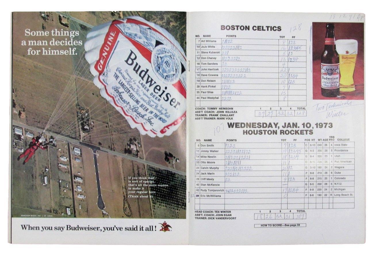 Offered is a January 10, 1973 Boston Celtics vs. Houston Rockets NBA Program John Havlicek. The scorecard has hand written scoring.