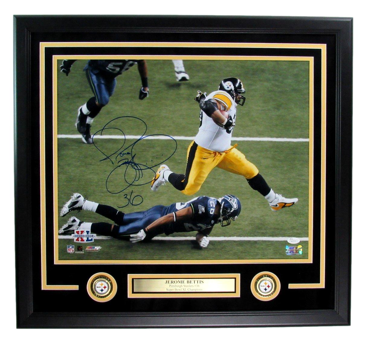 Offered is a Jerome Bettis HOF Signed/Autographed 16x20 Photo Pittsburgh Steelers Framed. The outer frame size is 26 inches x 22 inches. This photo is authenticated by JSA and includes their Tamper-proof Hologram Sticker and Certificate of Authenticity.