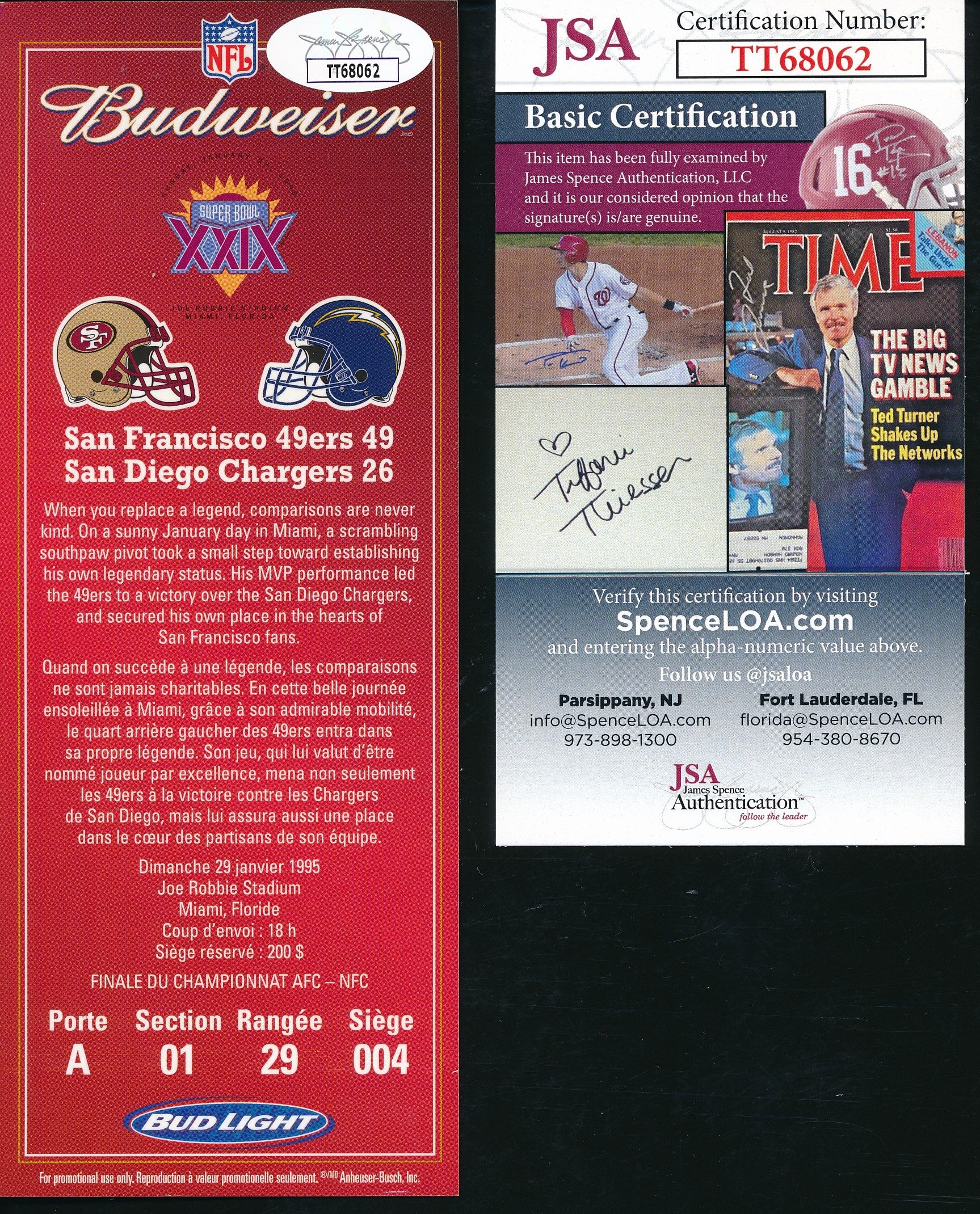 Offered is a Jerry Rice HOF Signed/Auto Super Bowl XXIX Replica Full Ticket San Francisco 49ers vs. San Diego Chargers. This ticket is authenticated by JSA and includes their tamper-proof sticker and certificate of authenticity