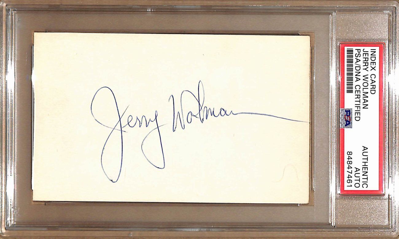 Offered is a Jerry Wolman Autographed 3x5 Index Card Owner Philadelphia Eagles. This index card is authenticated by PSA/DNA and is encapsulatd in their tamper-proof plastic case.