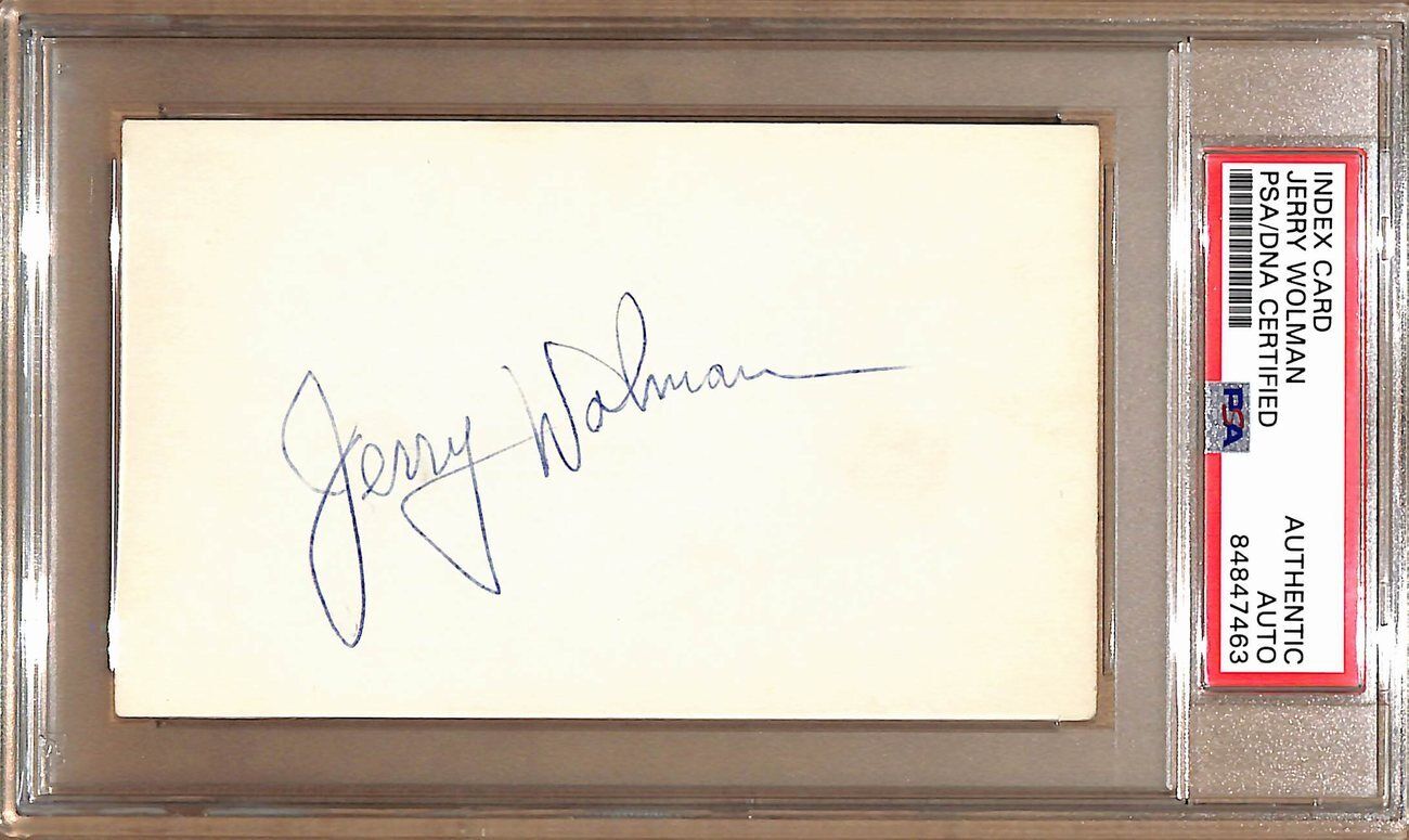 Offered is a Jerry Wolman Autographed 3x5 Index Card Owner Philadelphia Eagles. This index card is authenticated by PSA/DNA and is encapsulatd in their tamper-proof plastic case.