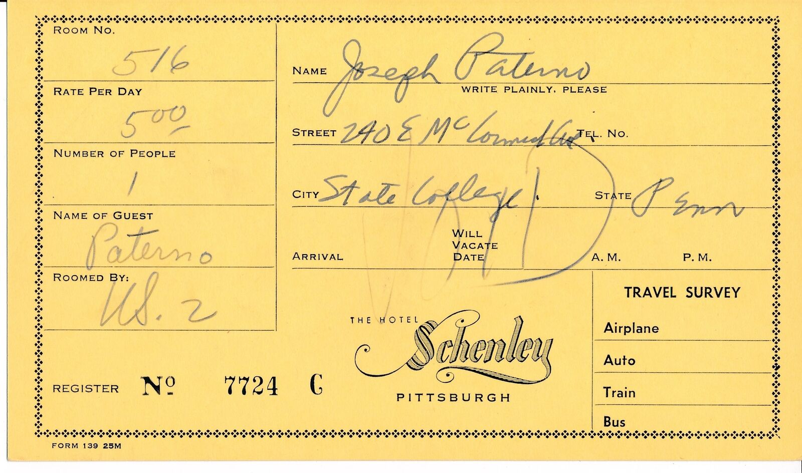Joe Paterno 1950's Penn State Signed Hotel Schenley Register Card PSA/DNA 163691