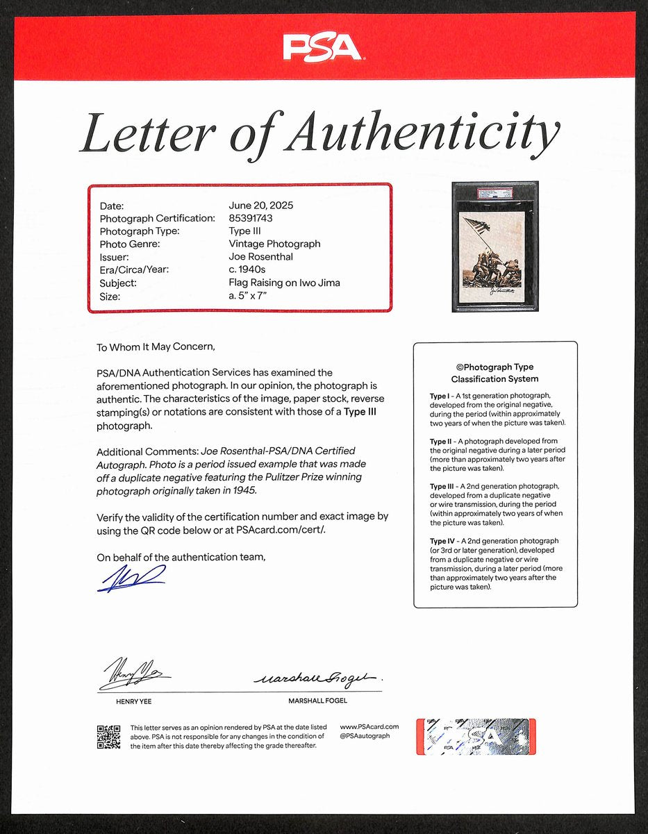 Offered is a Joe Rosenthal Signed Iwo Jima Flag-Raising Photo – PSA Authenticated Type III.