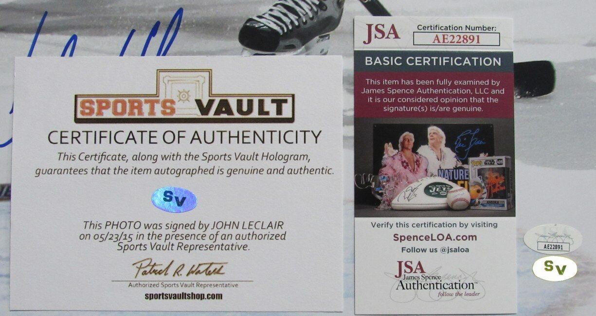 Offered is a John LeClair Autographed 16x20 Photo Philadelphia Flyers. This photo is authenticated by JSA and Sports Vault and includes their Tamper-proof Stickers and Certificates of Authenticity.