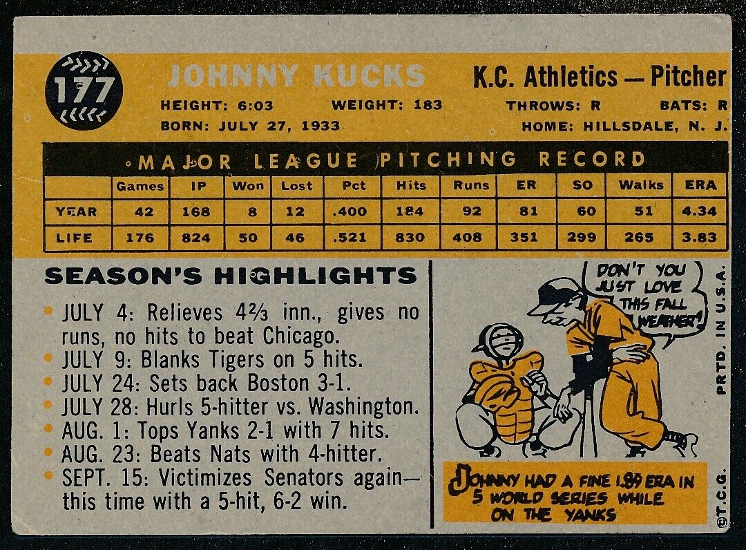 Offered is a Johnny Kucks Kansas City Athletics Signed/Autographed 1960 TOPPS Card #177.
