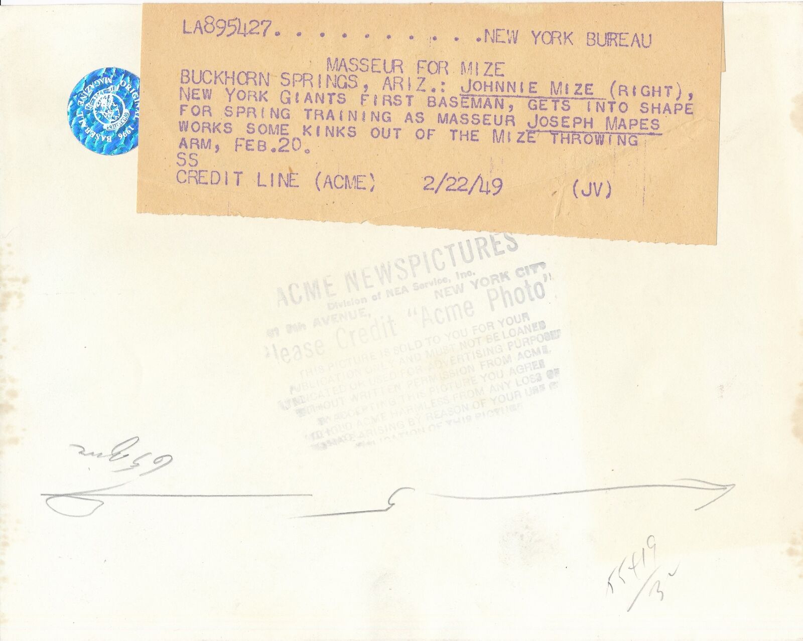 Offered is a Johnny Mize HOF 6x8 B/W 1949 Press Wire Photo New York Giants.