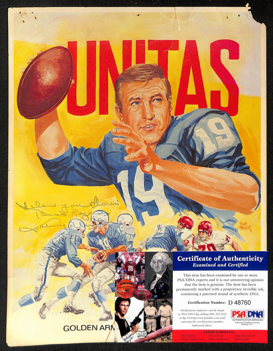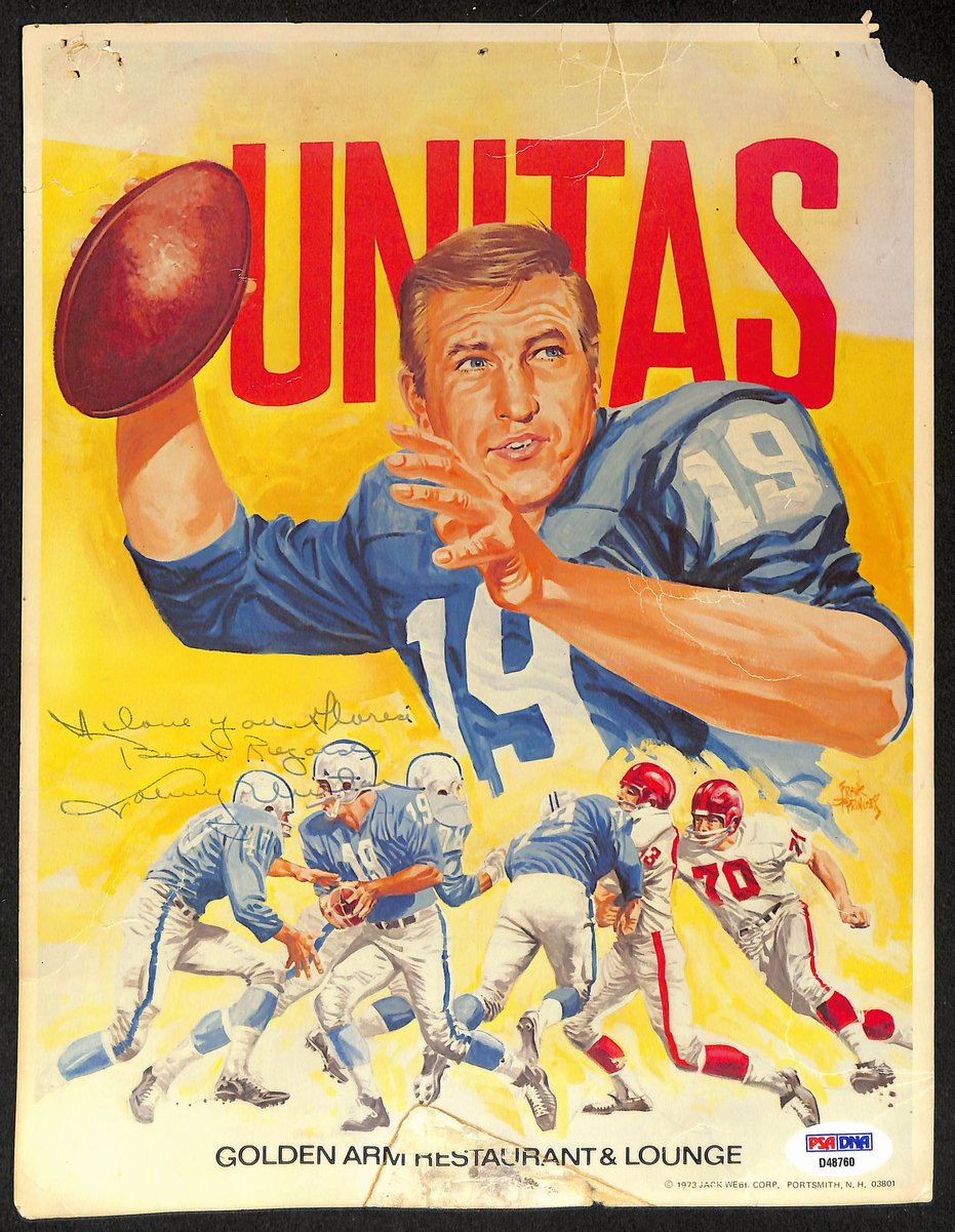 Offered is a Johnny Unitas HOF Signed/Autographed 8.5x11 Golden Arm Restaurant Drawing. This drawing is authenticated by PSA/DNA and includes their tamper-proof hologram sticker and Certificate of Authenticity.