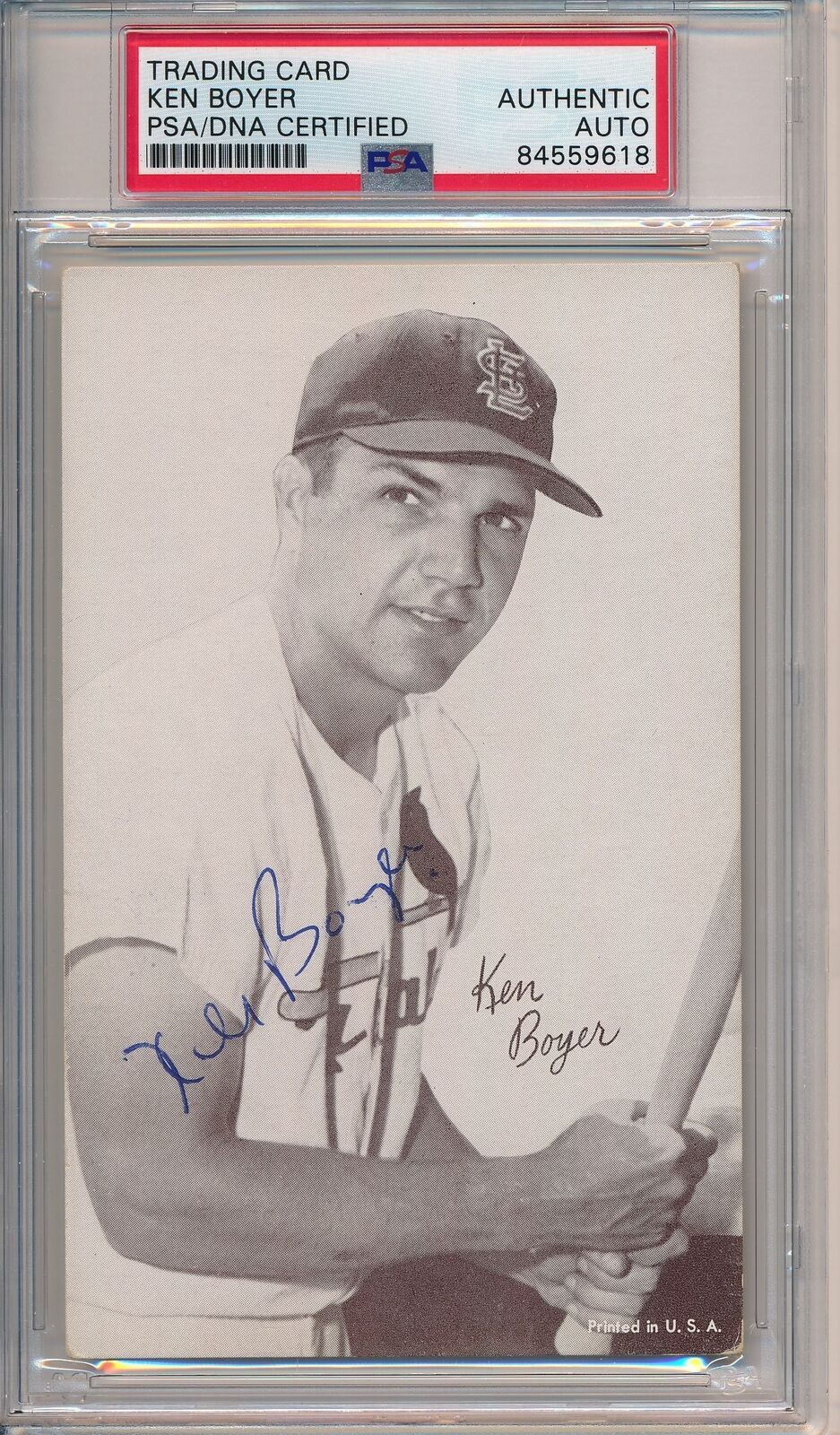 Offered is a Ken Boyer St. Louis Cardinals Signed/Autographed 3.5x5.5 B/W Exhibit Postcard. This card comes encapsulated in a tamper-proof holder and autograph has been authenticated by PSA/DNA.
