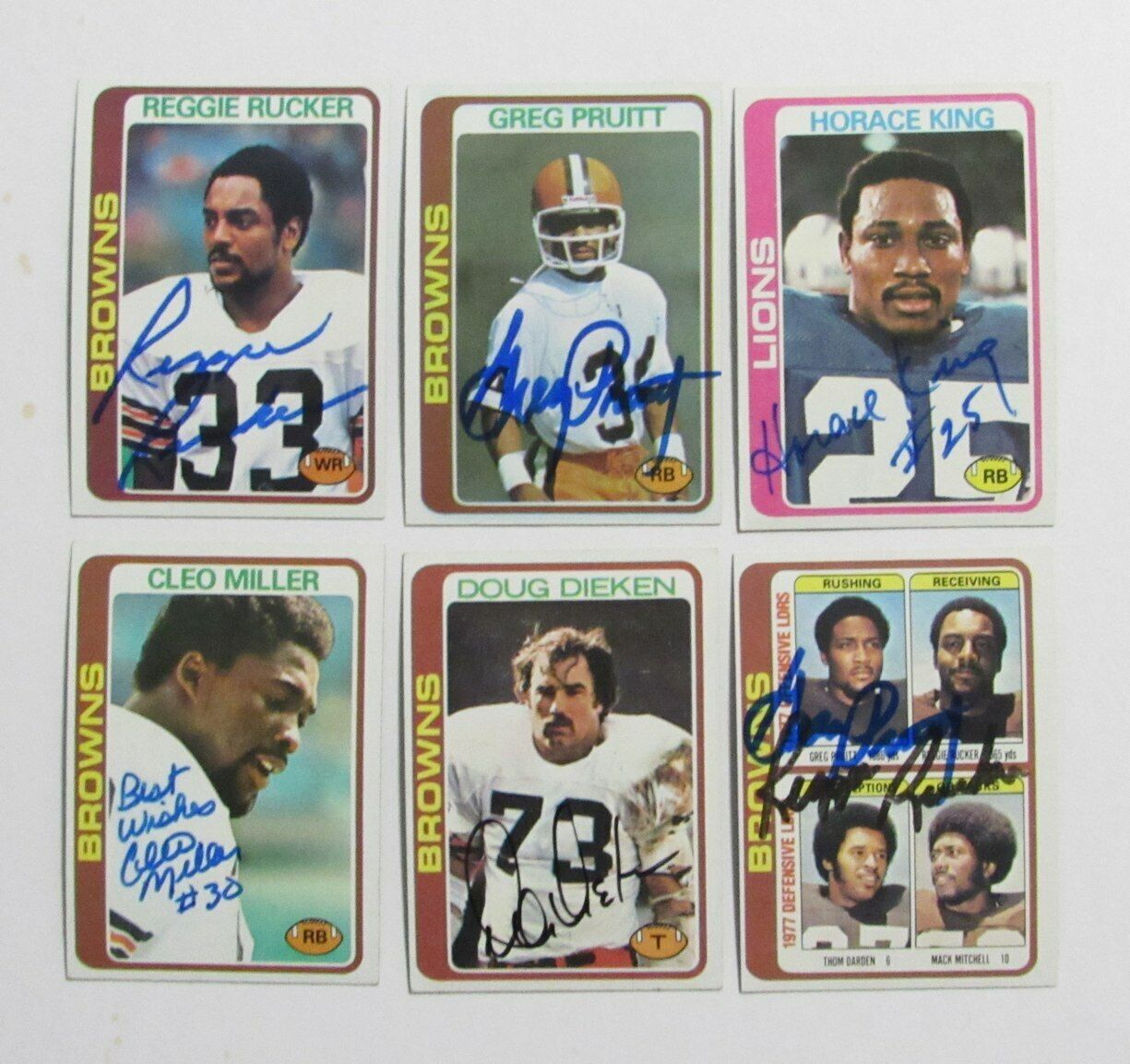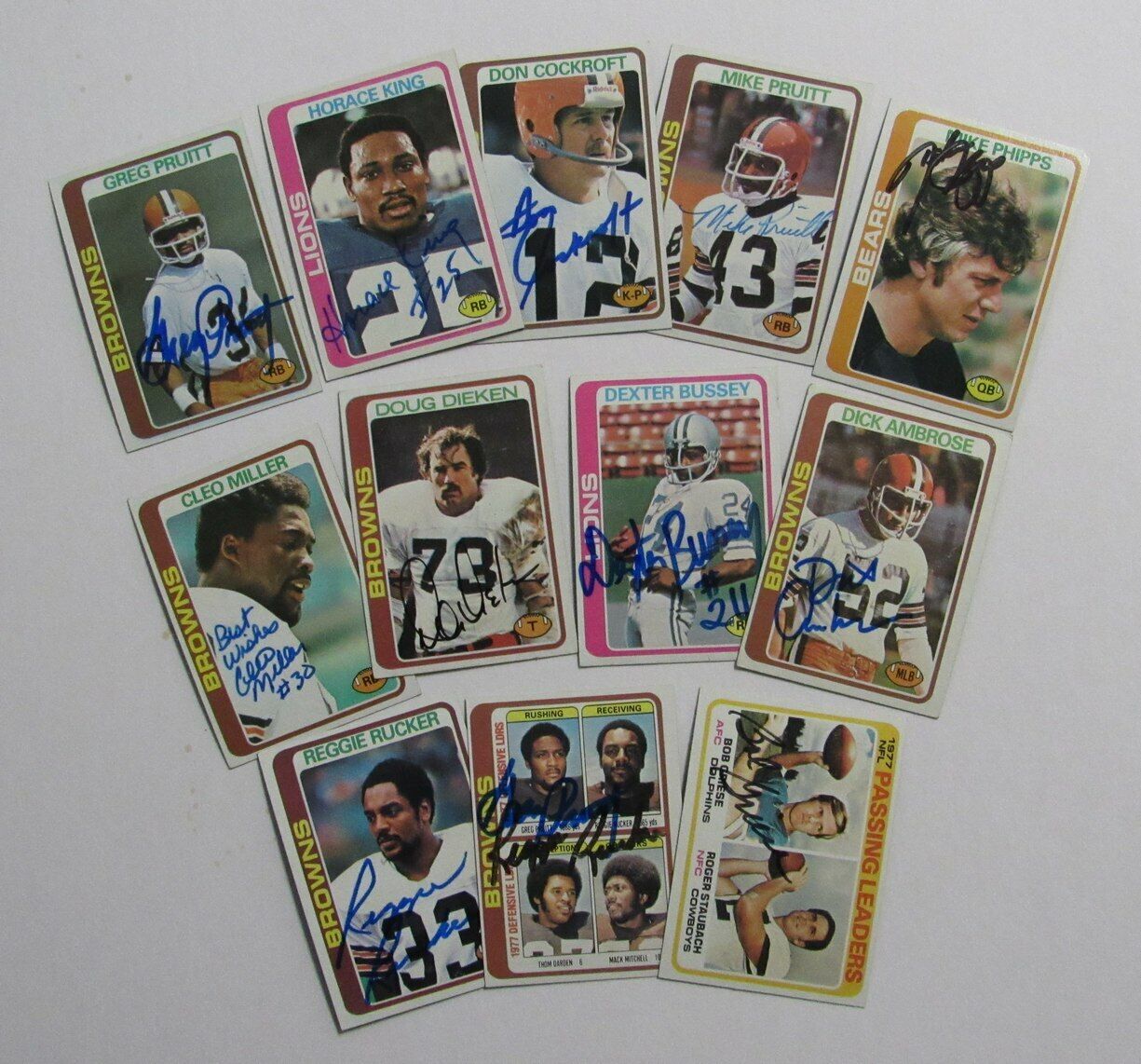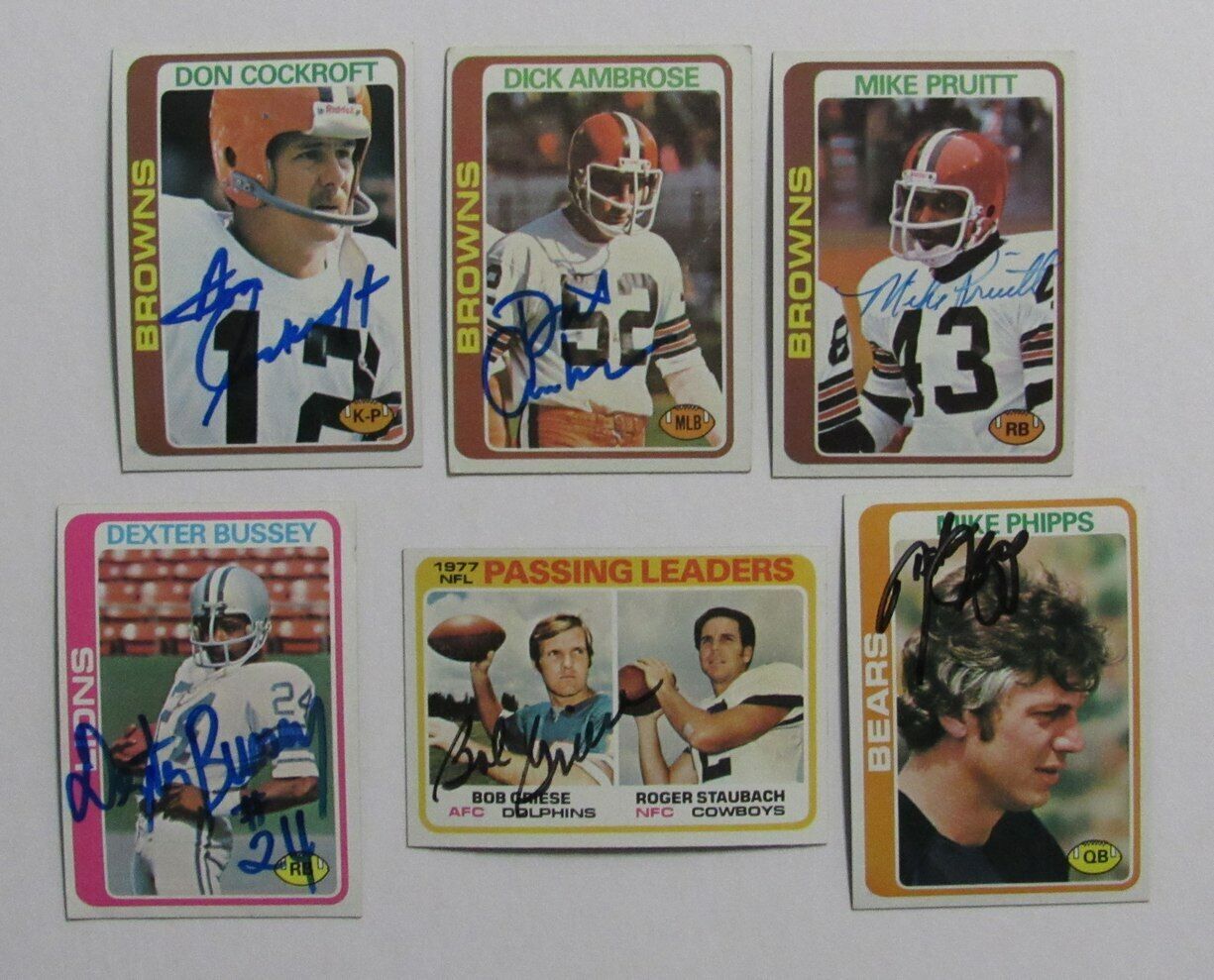 Offered is a Lot of 12 Signed/Autographed 1978 Topps Football Cards. Signatures are by 331-Bob Griese, 473-Reggie Rucker, 394-Cleo Miller, 413-Doug Dieken, 245-Greg Pruitt, 506-Greg Pruitt, 506-Reggie Rucker, 93- Mike Pruitt, 178-Horace King, 454-Dick Ambrose, 427-Dexter Bussey, 33-Don Cockroft, and 377-Mike Phipps. The autographs are guaranteed to pass any third party authentication.