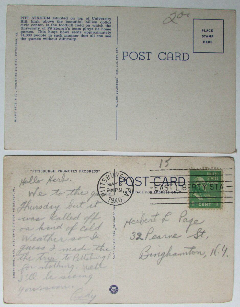 Lot of 2 University of Pittsburgh Vintage 1940 Pitt Stadium Postcards 147501