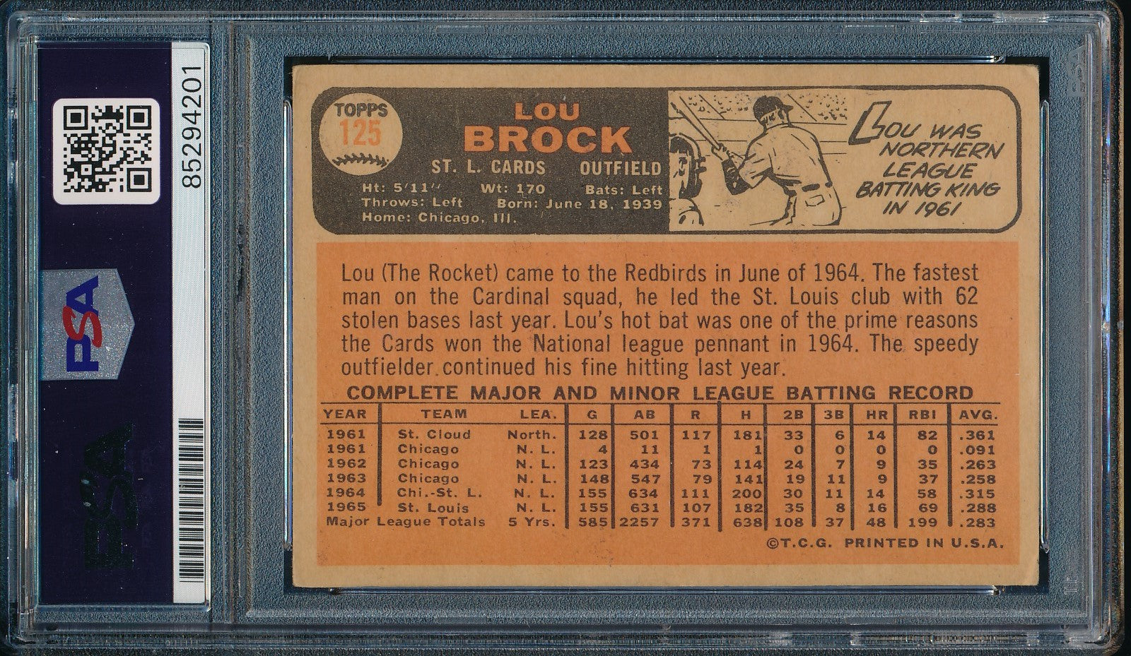 Offered is a Lou Brock HOF Signed/Autographed 1966 Topps Card #125 St. Louis Cardinals. This card is authenticated by PSA/DNA and is encapsulated in their tamper-proof plastic case.