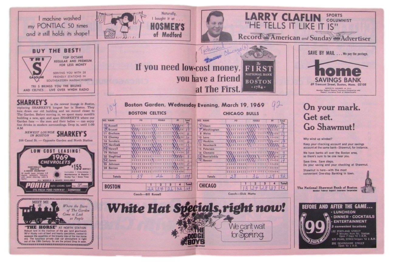 Offered is a March 19, 1969 Boston Celtics vs. Chicago Bulls Boston Garden Program. The Scorecard has hand written scoring.