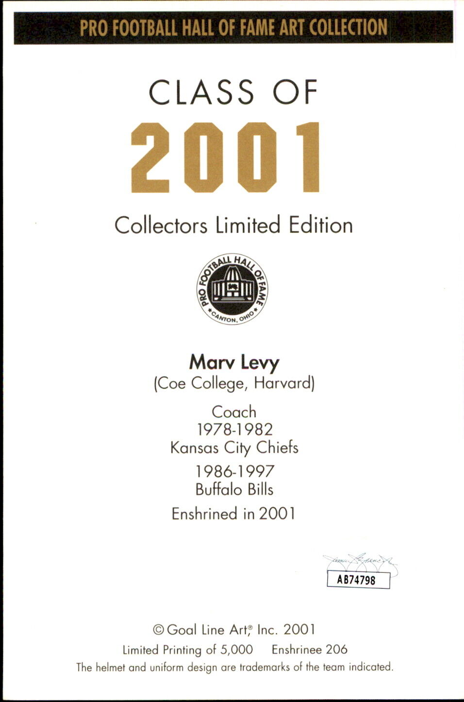 Offered is a Marv Levy HOF Autographed/Inscribed "HOF 01" Goal Line Art GLAC Postcard Bills. This postcard is authenticated by JSA and includes their Tamper-proof Sticker and certificate of Authenticity.