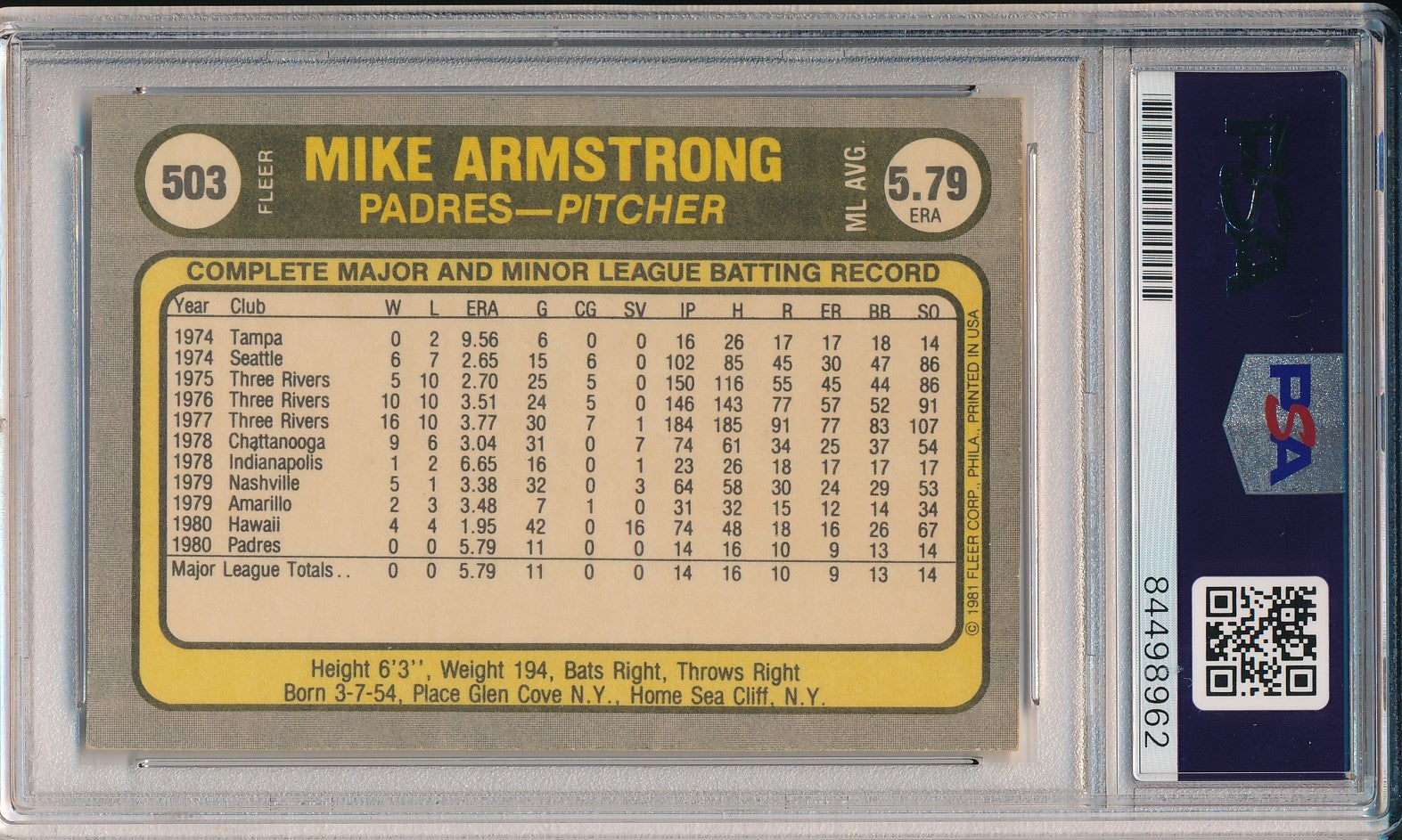 Offered is a Mike Armstrong San Diego Padres Signed/Auto 1981 FLEER Card #503. This card is authenticated by PSA/DNA and is encapsulated in their Tamper-proof Plastic Case.