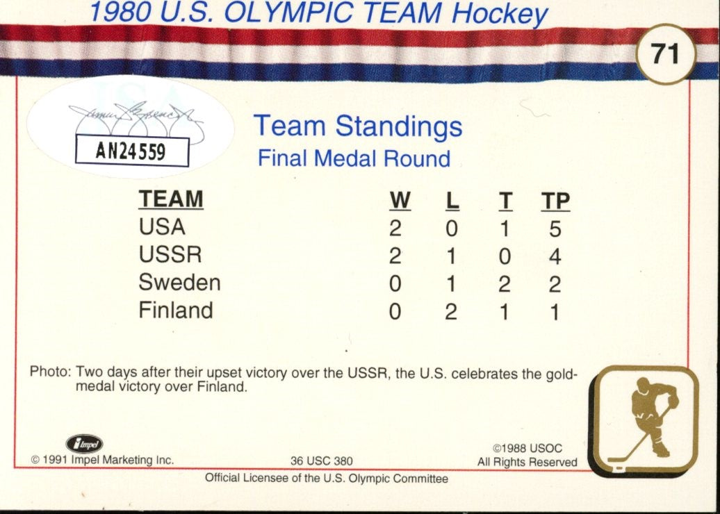Offered is a Mike Eruzione Signed/Auto 1991 Impel Card #71 1980 U.S. Olympic Hockey Team. This card is authenticated by JSA and includes their Tamper-proof Sticker and Certificate of Authenticity.