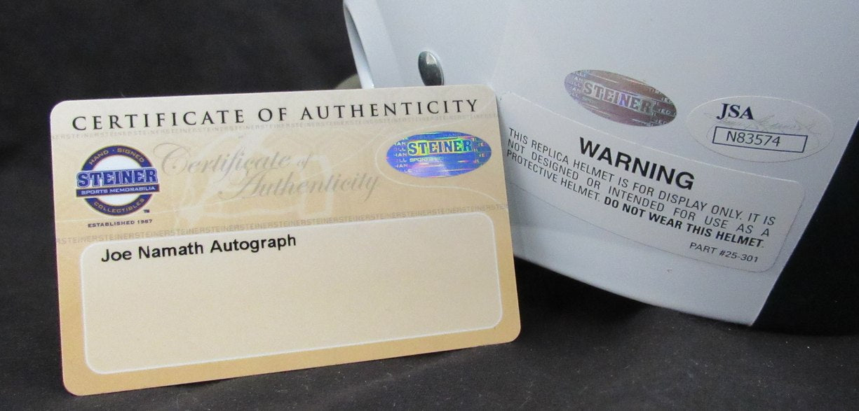 This helmet is guaranteed to be the marquee item in your football collection for years to come. The Namath autograph is authenticated by Steiner Sports and comes with their hologram and certificate of authenticity. Steiner Sports is the leading New York memorabilia company having been in the industry for over 32 years. The Boozer and Snell autographs were certified by James Spence Authentication , the foremost autograph authentication company in the world.