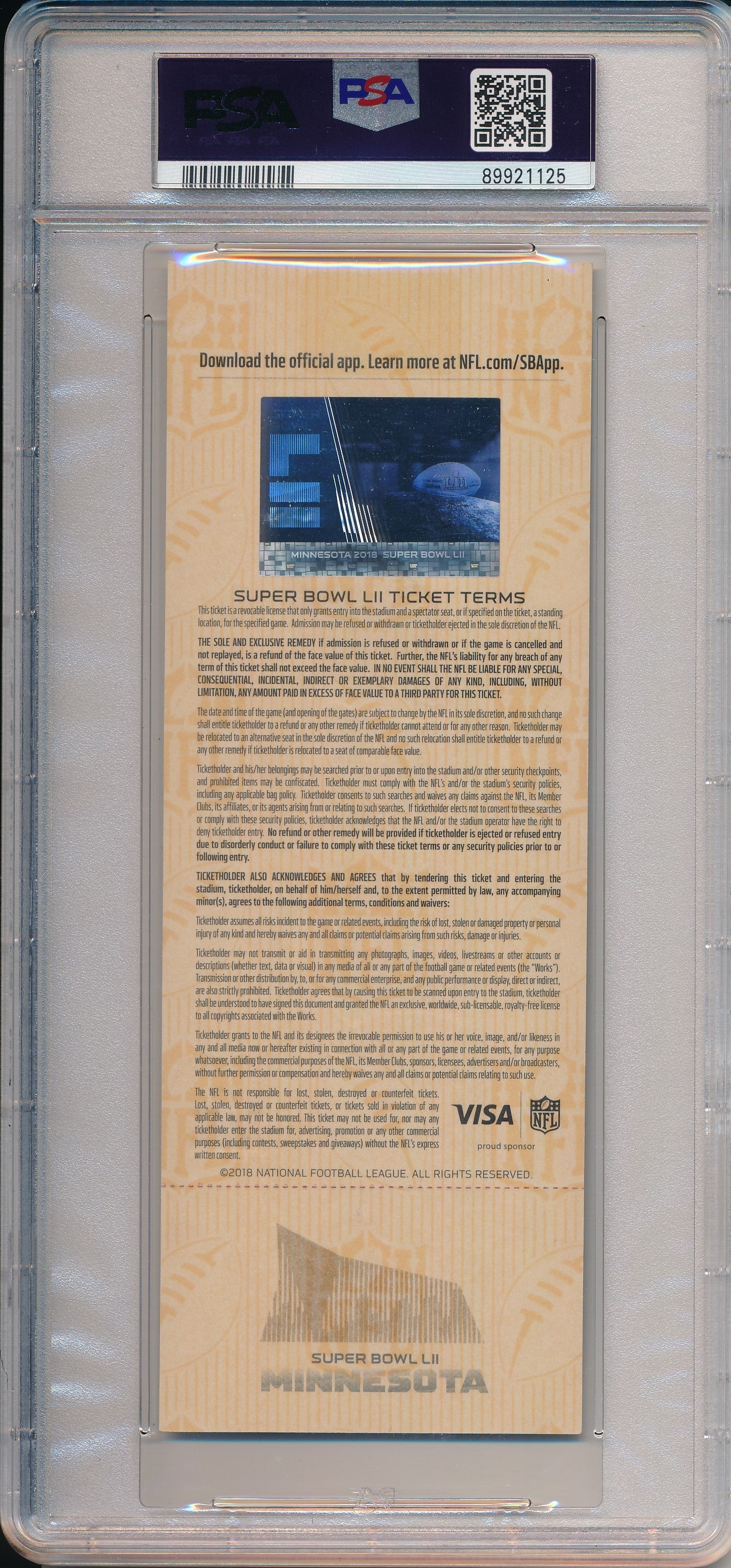 Nick Foles Autographed/Inscribed "SBLII MVP" 2018 Super Bowl 52 LII FULL Authentic Ticket Philadelphia Eagles. This ticket is authenticated by PSA/DNA and is encapsulated in their tamper-proof plastic case. The autograph is graded AUTO 9.