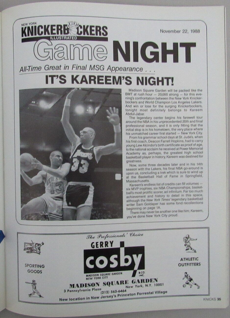November 22, 1988 Kareem Abdul-Jabbar Night Lakers vs. Knicks Tribute Program