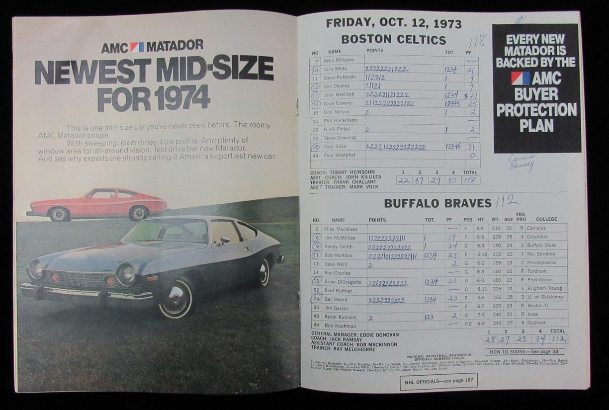 Offered is an October 12, 1973 Basketball Game Program Boston Celtics vs. Buffalo Braves. NOTE: There is handwritten scoring on the Scorecard pages.