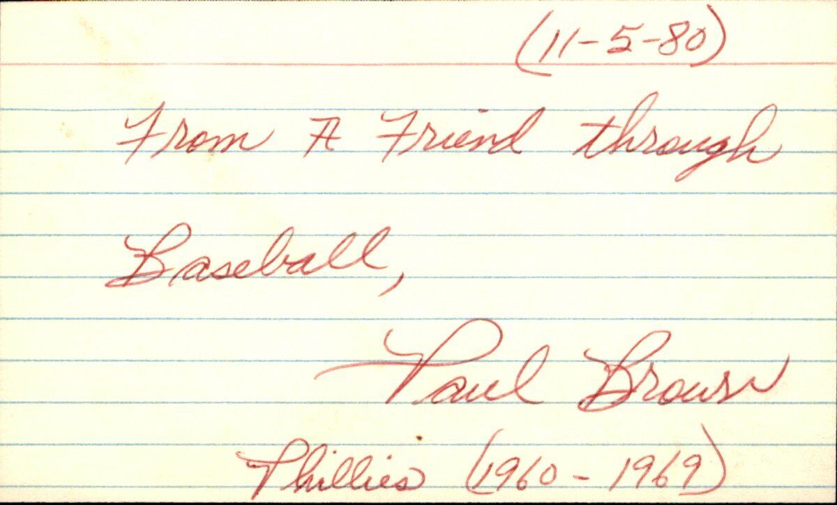 Paul Brown Philadelphia Phillies Signed/Autographed 3x5 IndexCard 162551