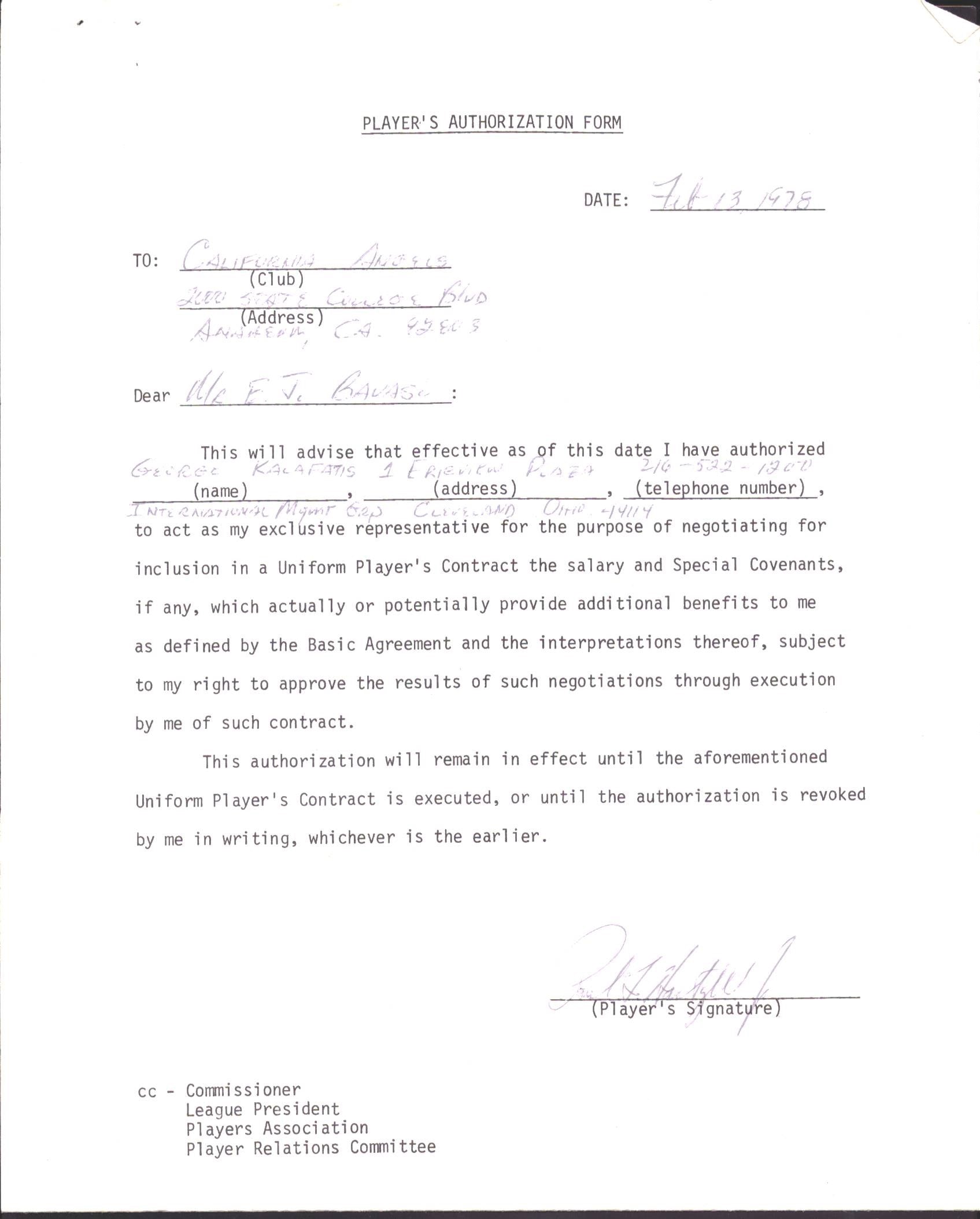 Paul Hartzell California Angels Signed 1978 Player's Authorization Form 151591