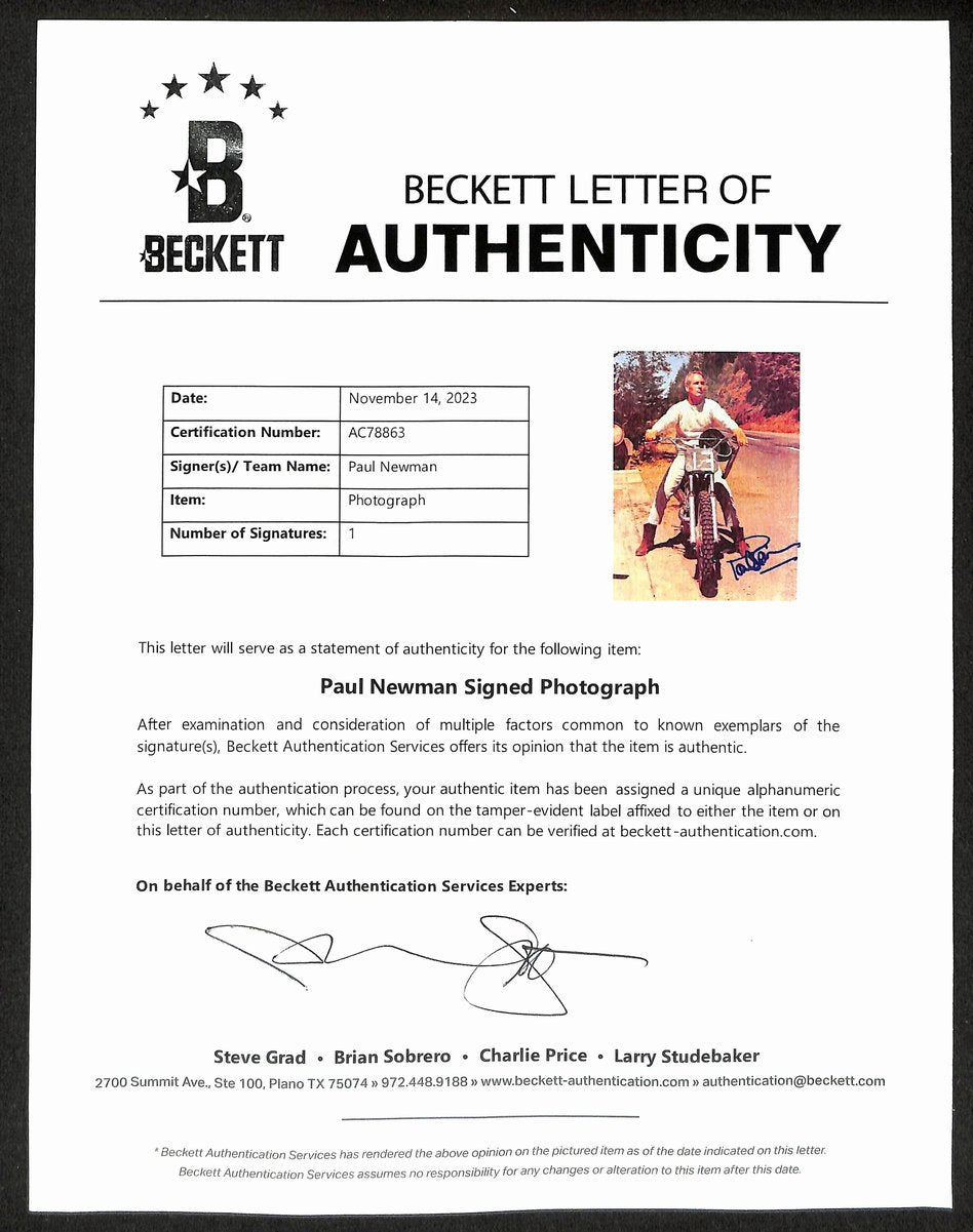 Offered is a Paul Newman Signed/Autographed 8x10 Photo capturing him on his Motorcycle from his 1970 film Sometimes a Great Notion. Its a classic shot of Newman who was known for his passion for racing of any kind. This photo is authenticated by BAS/Beckett and is encapsulated in their tamper-poof acrylic case.
