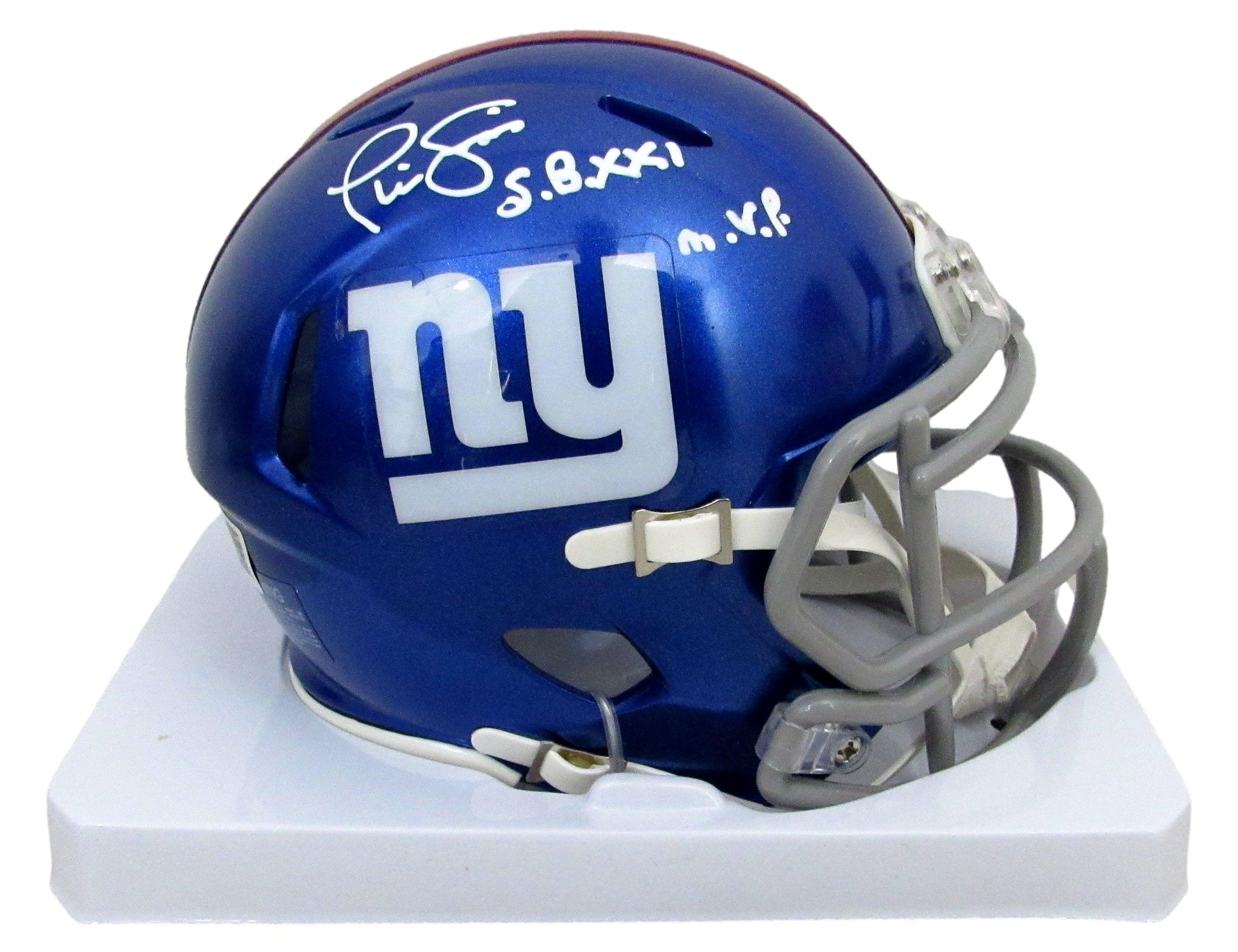 Offered is a Phil Simms Signed/Inscribed "SB XXI M.V.P." Mini Football Helmet New York Giants. This helmet is authenticated by BAS/Beckett and includes their tamper-proof hologram sticker.