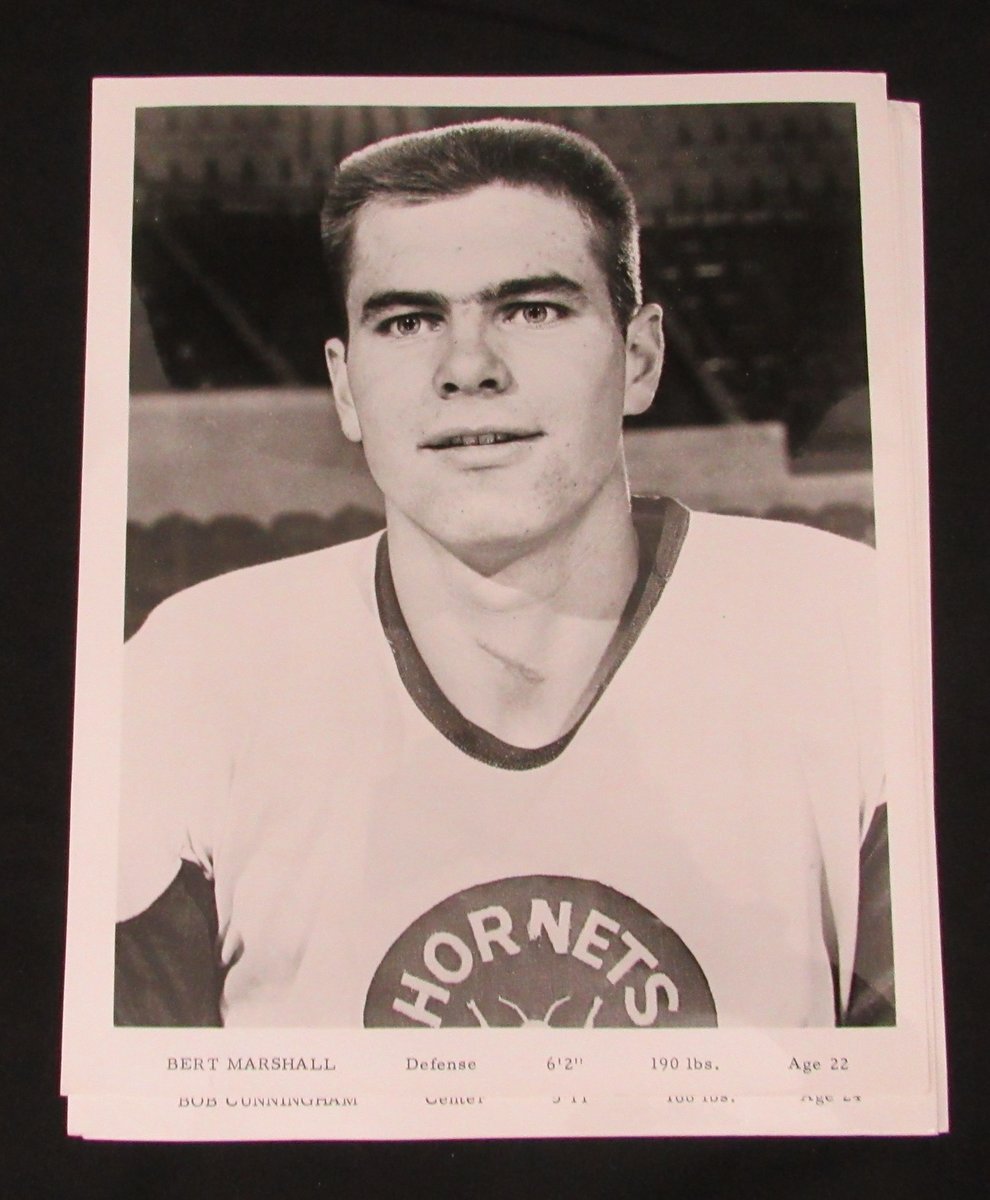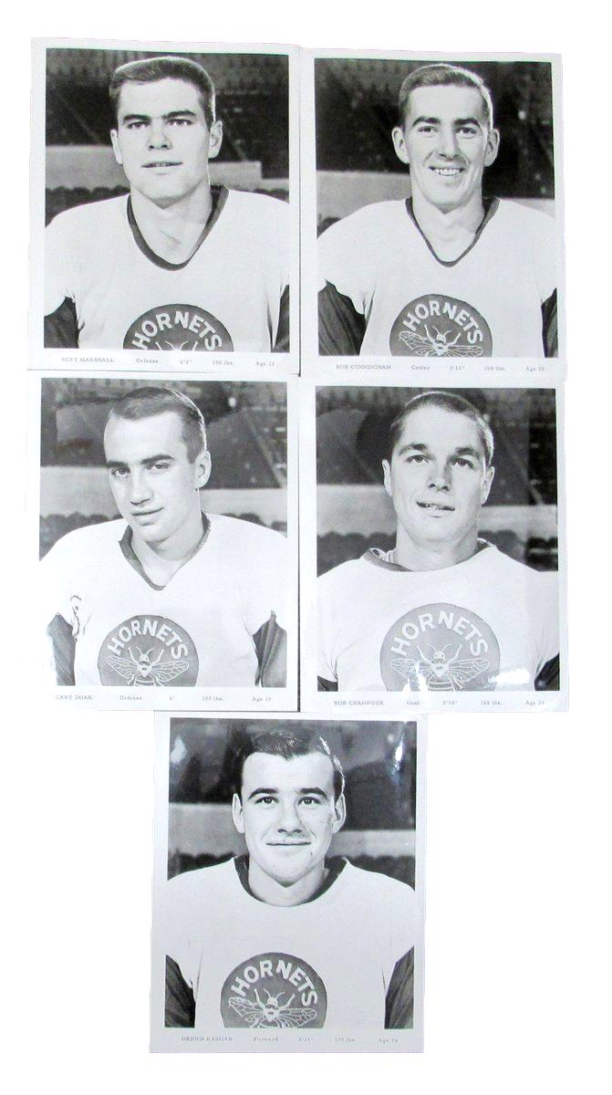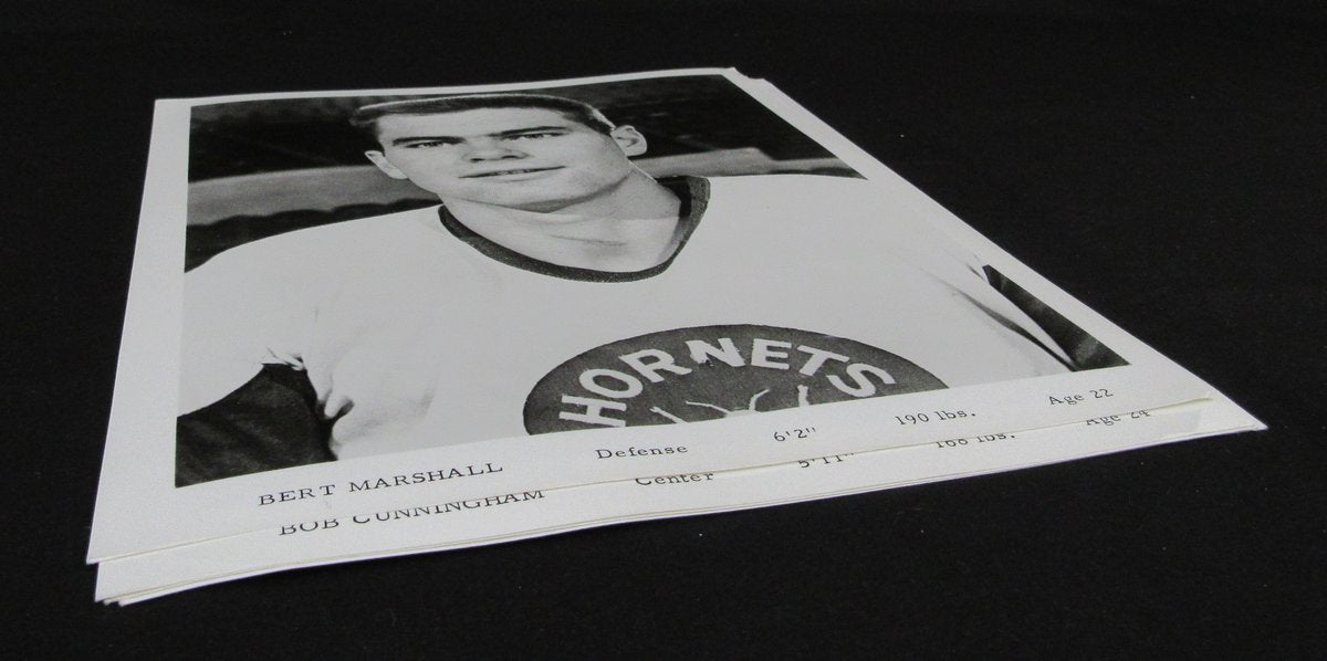 Offered are Pittsburgh Hornets AHL five 1965-66 Team Issued 8x10 Photos. The Hornets were a minor league affiliation of the Detroit Red Wings and played home games at the Civic Arena. The five photos are Bert Marshall, Bob Cunningham, Gary Doak, Bob Champoux, and Dennis Kassian.