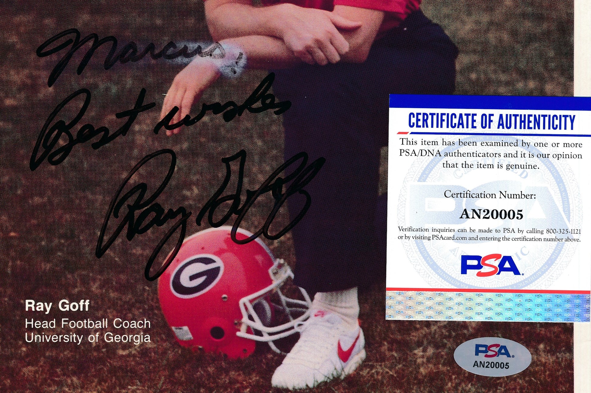 Offered is a Ray Goff Signed/Inscribed 8x10 Photo Georgia Football Coach. This photo is authenticated by PSA/DNA and is includes their tamper-proof sticker and certificate of authenticity.