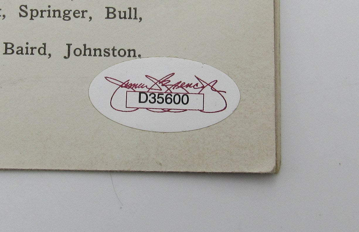 Offered is a Rip Miller signed/autographed November 4, 1933 Navy vs. Notre Dame Football Game Program He was one of the 7 Mules. This program is in good condition, with the middle pages loose and creased vertically down the middle. The autograph is authenticated by JSA and includes their tamper proof sticker of authenticity.