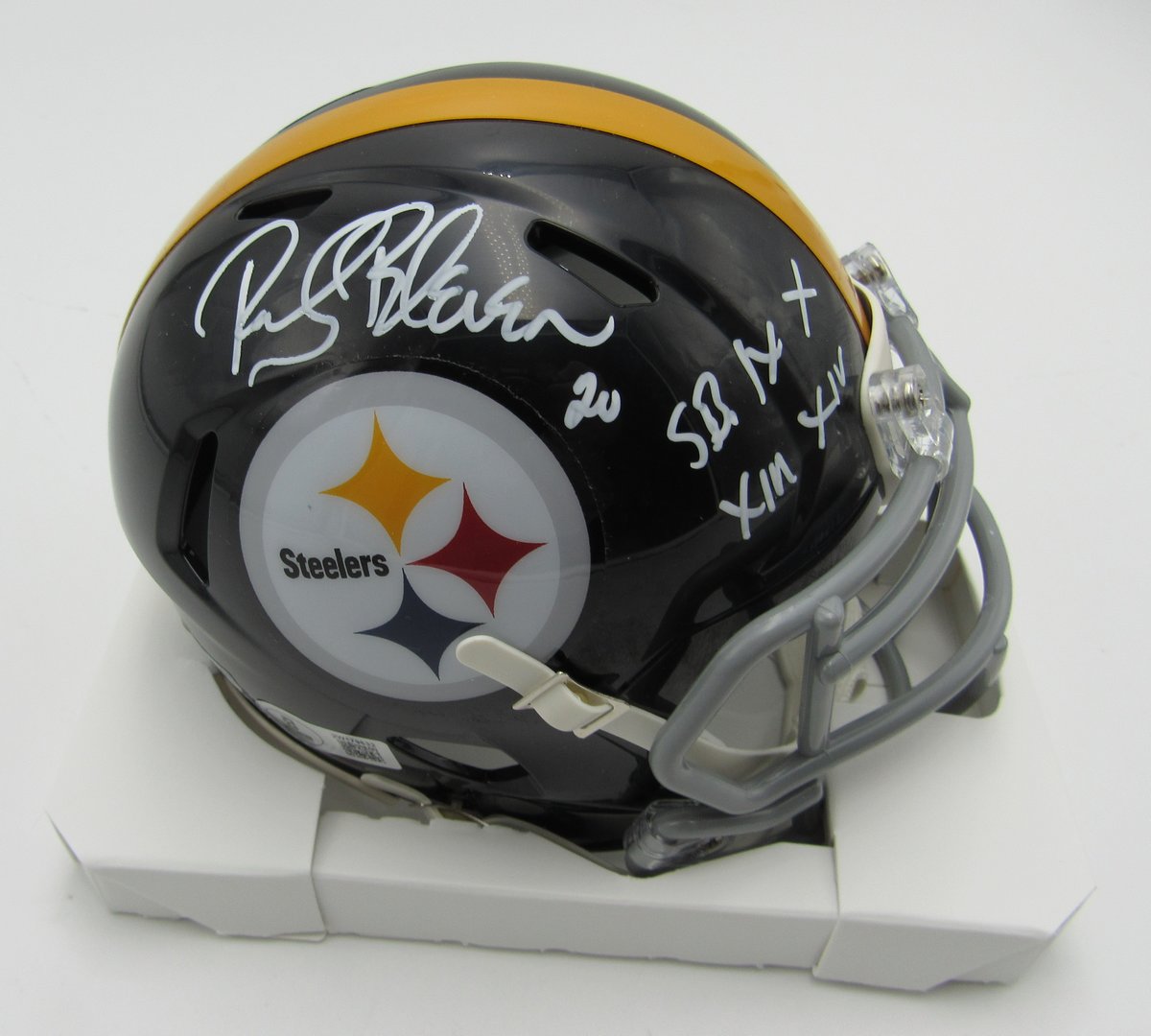 Offered is a Rocky Bleier HOF Signed/Inscribed "SB IX X XIII XIV" Black Mini Football Helmet Pittsburgh Steelers. This helmet is authenticated by BAS/Beckett Witness and includes their Tamper-proof Hologram Sticker.