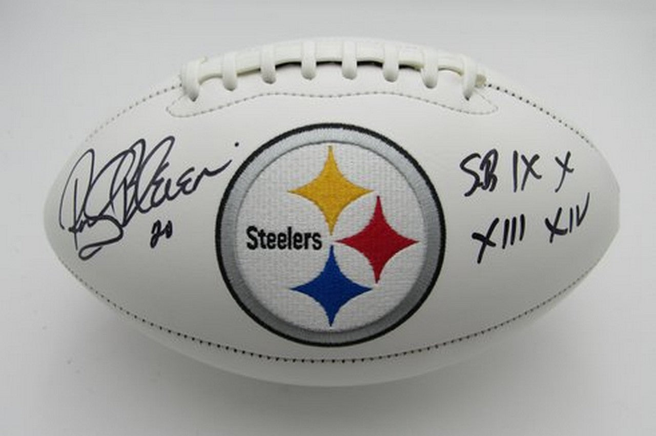 Offered is a Rocky Bleier HOF Signed/Inscribed "SB IX X XIII XIV" White Steelers Logo Football. This football is authenticated by BAS/Beckett Witness and includes their Tamper-proof Hologram Sticker.
