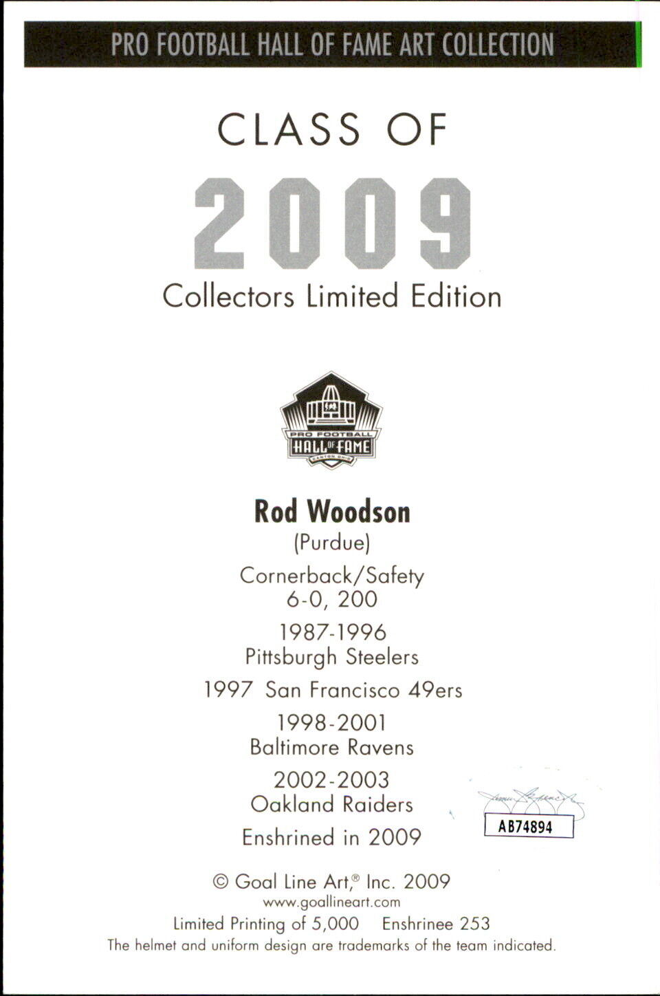 Offered is a Rod Woodson HOF Autographed/Inscribed "HOF 09" Goal Line Art GLAC Postcard Pittsburgh Steelers. This postcard is authenticated by JSA and includes their Tamper-proof Sticker and certificate of Authenticity.