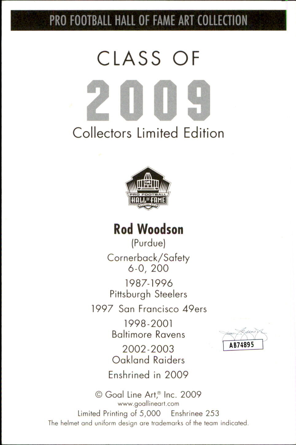 Offered is a Rod Woodson HOF Autographed/Inscribed "HOF 09" Goal Line Art GLAC Postcard Pittsburgh Steelers. This postcard is authenticated by JSA and includes their Tamper-proof Sticker and certificate of Authenticity.