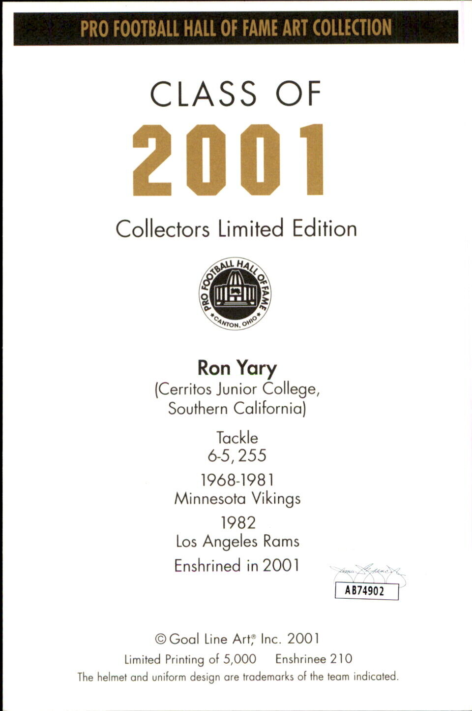 Offered is a Ron Yary HOF Autographed/Inscribed "HOF-01" Goal Line Art GLAC Postcard Minnesota Vikings. This postcard is authenticated by JSA and includes their Tamper-proof Sticker and certificate of Authenticity.