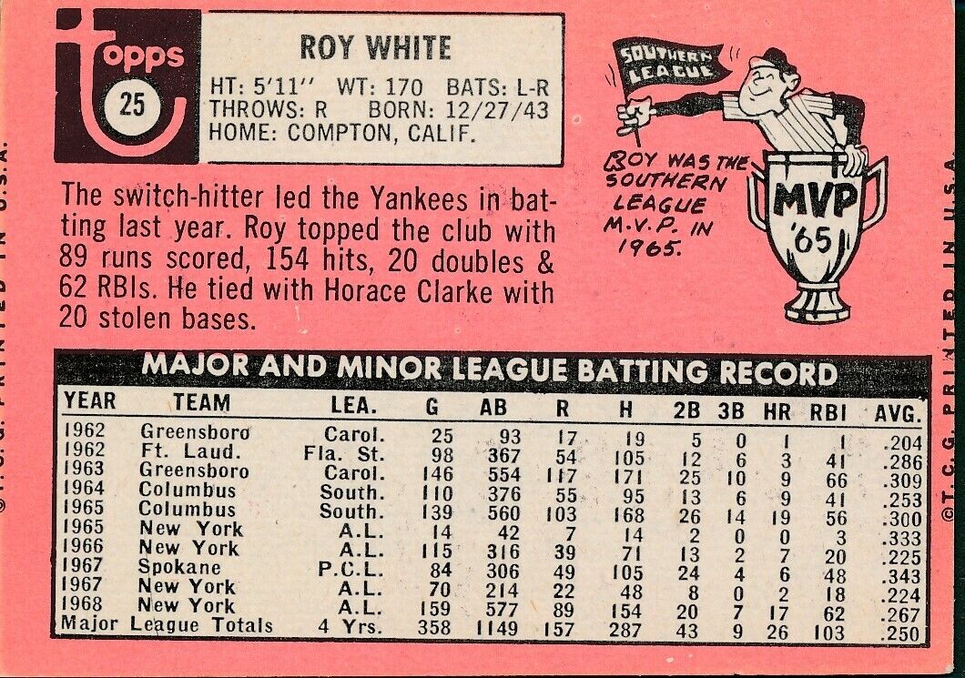 Roy White Yankees Signed/Autographed 1969 Topps Baseball Card #25 162305