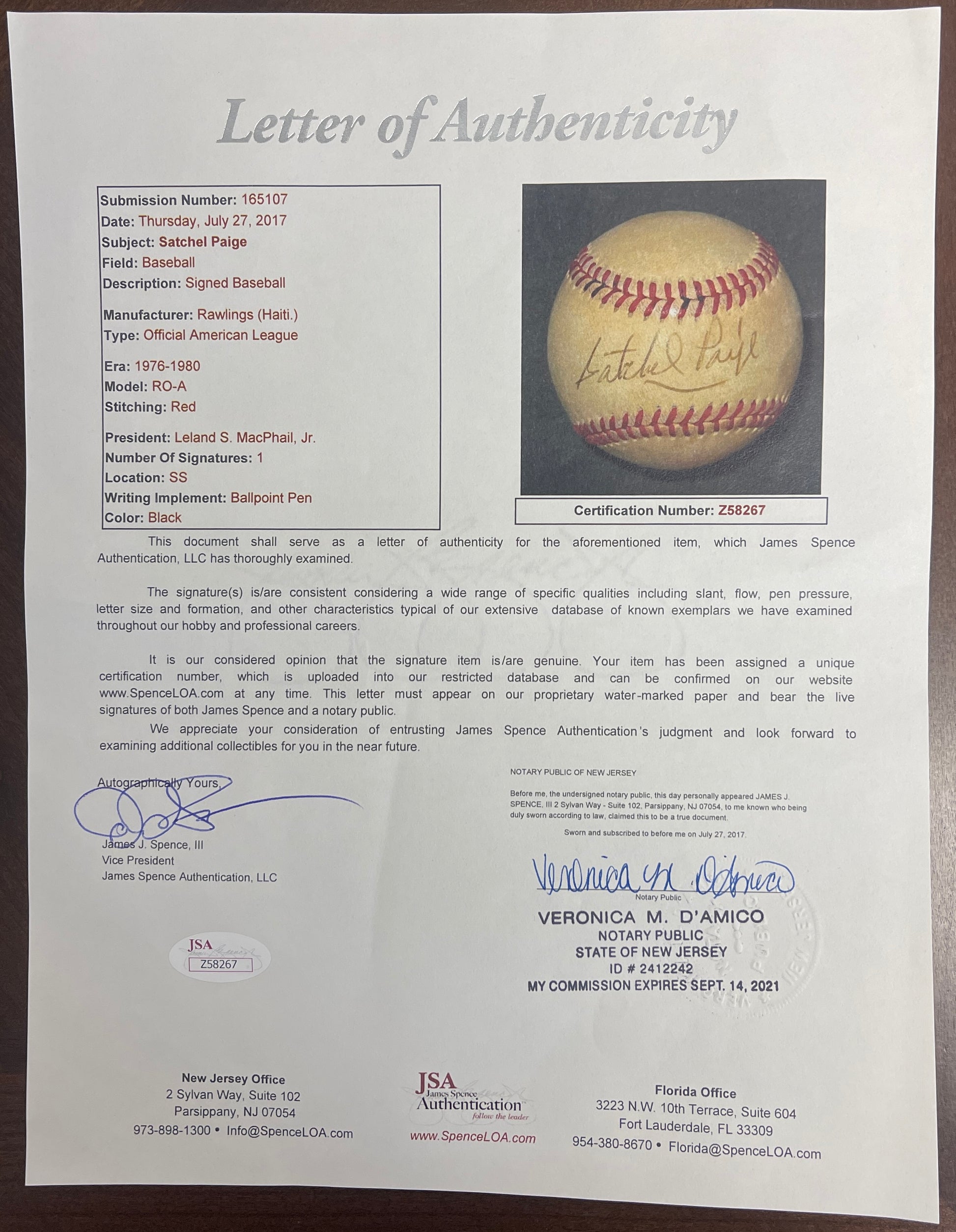 Offered is a Satchel Paige HOF Single Signed/Autographed OAL/McPhail Baseball Kansas City Athletics. This ball is authenticated by JSA and includes their tamper-proof hologram sticker and Letter of Authenticity.