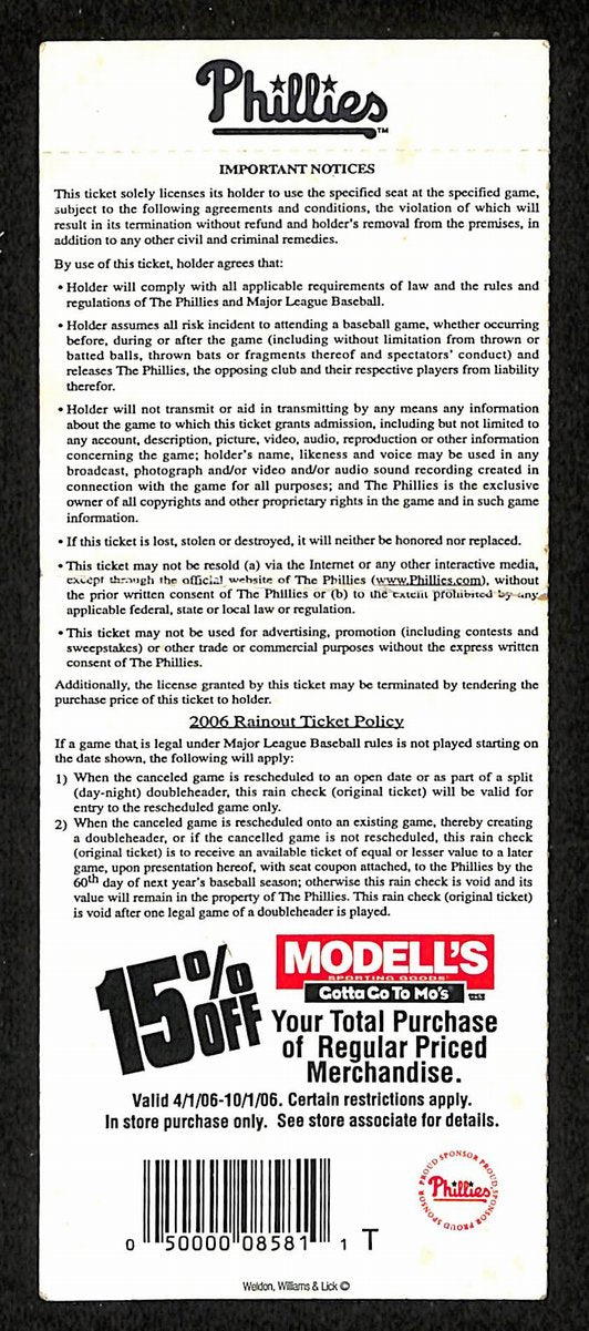 Offered is a September 4, 2006 Full Ticket Philadelphia Phillies vs. Houston Astros Cole Hamels Pitches Near Perfect Game.