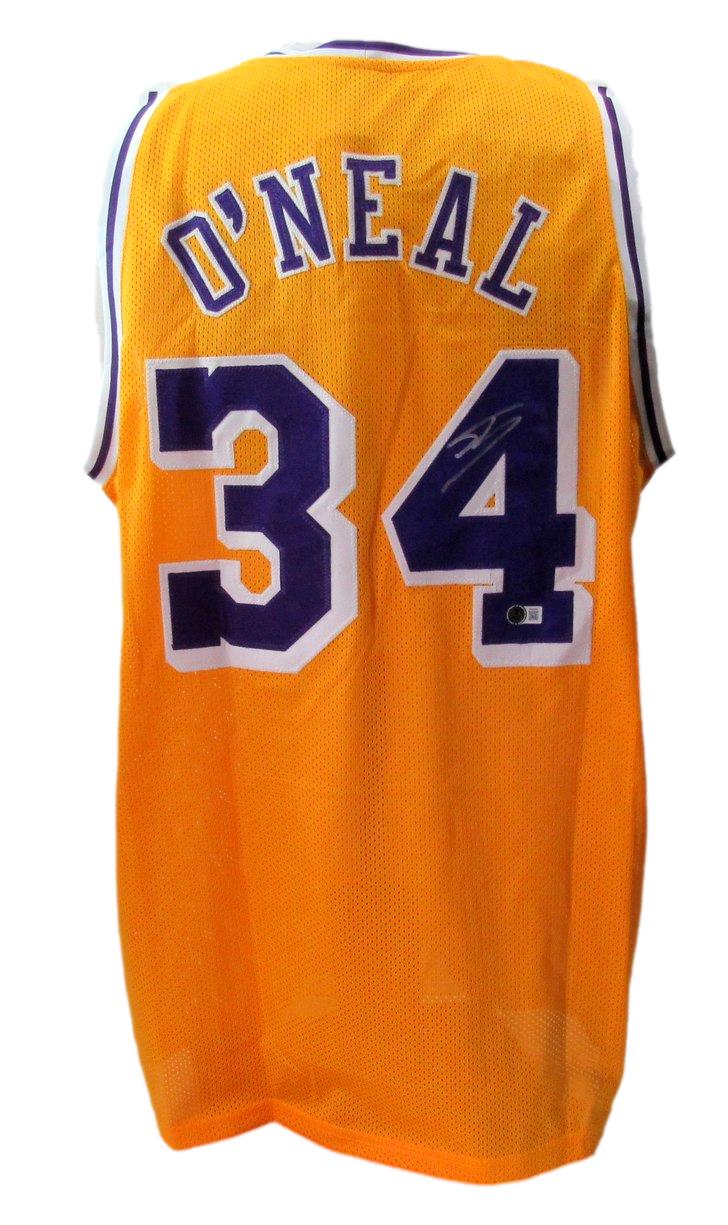 Offered is a Shaquille O'Neal HOF Autographed Gold Custom Basketball Jersey Los Angeles Lakers Size XL. This jersey is authenticated by BAS/Beckett and includes their Tamper-proof Hologram Sticker.