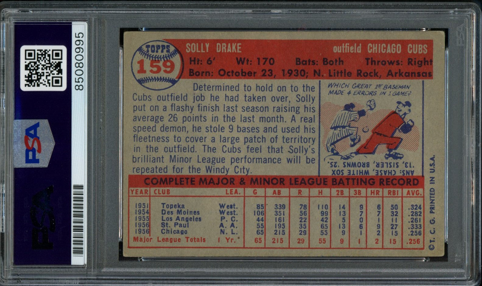 Offered is a Solly Drake Signed 1957 Topps Trading Card #159 Chicago Cubs. This Card is authenticated by PSA/DNA and is encapsulated in their tamper-proof plastic case.