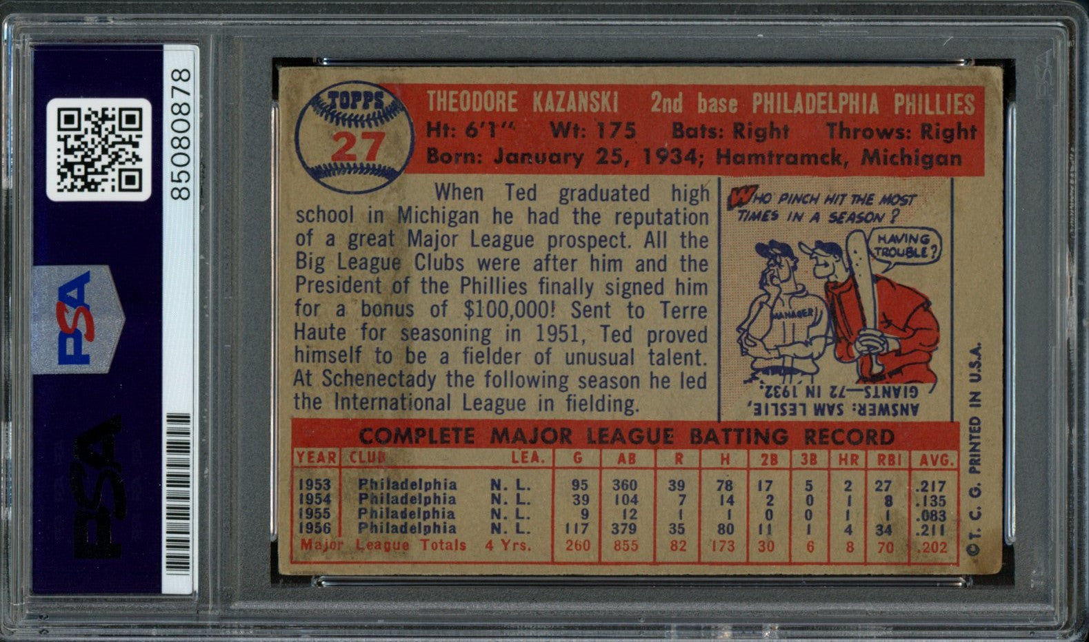Offered is a Ted Kazanski Signed 1957 Topps Trading Card #27 Philadelphia Phillies. This Card is authenticated by PSA/DNA and is encapsulated in their tamper-proof plastic case.