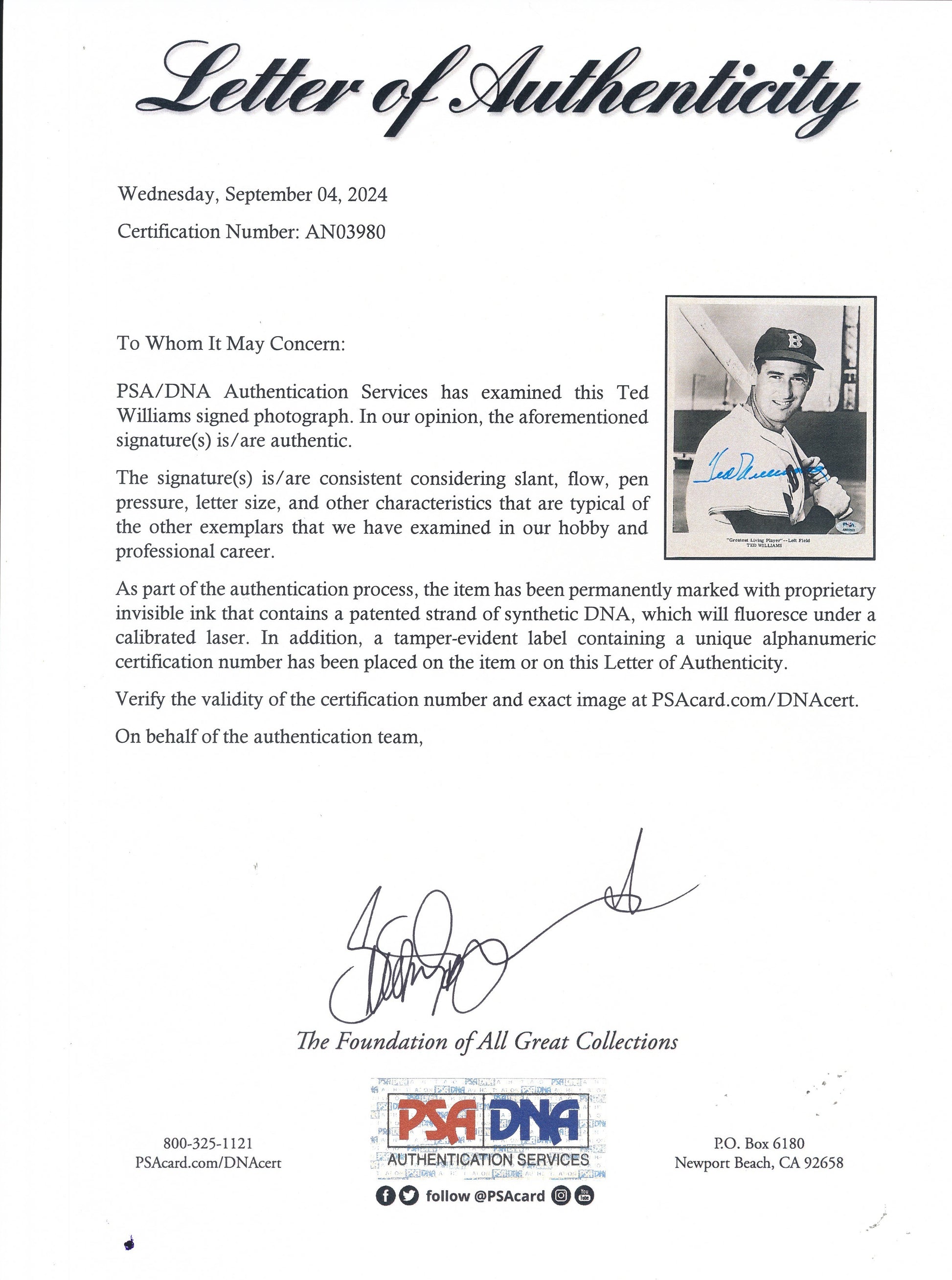 Offered is a Ted Williams HOF Signed/Autographed 8x10 B/W Photo Boston Red Sox. This photo is authenticated by PSA/DNA and includes their Tamper-proof Hologram Sticker and Letter of Authenticity.