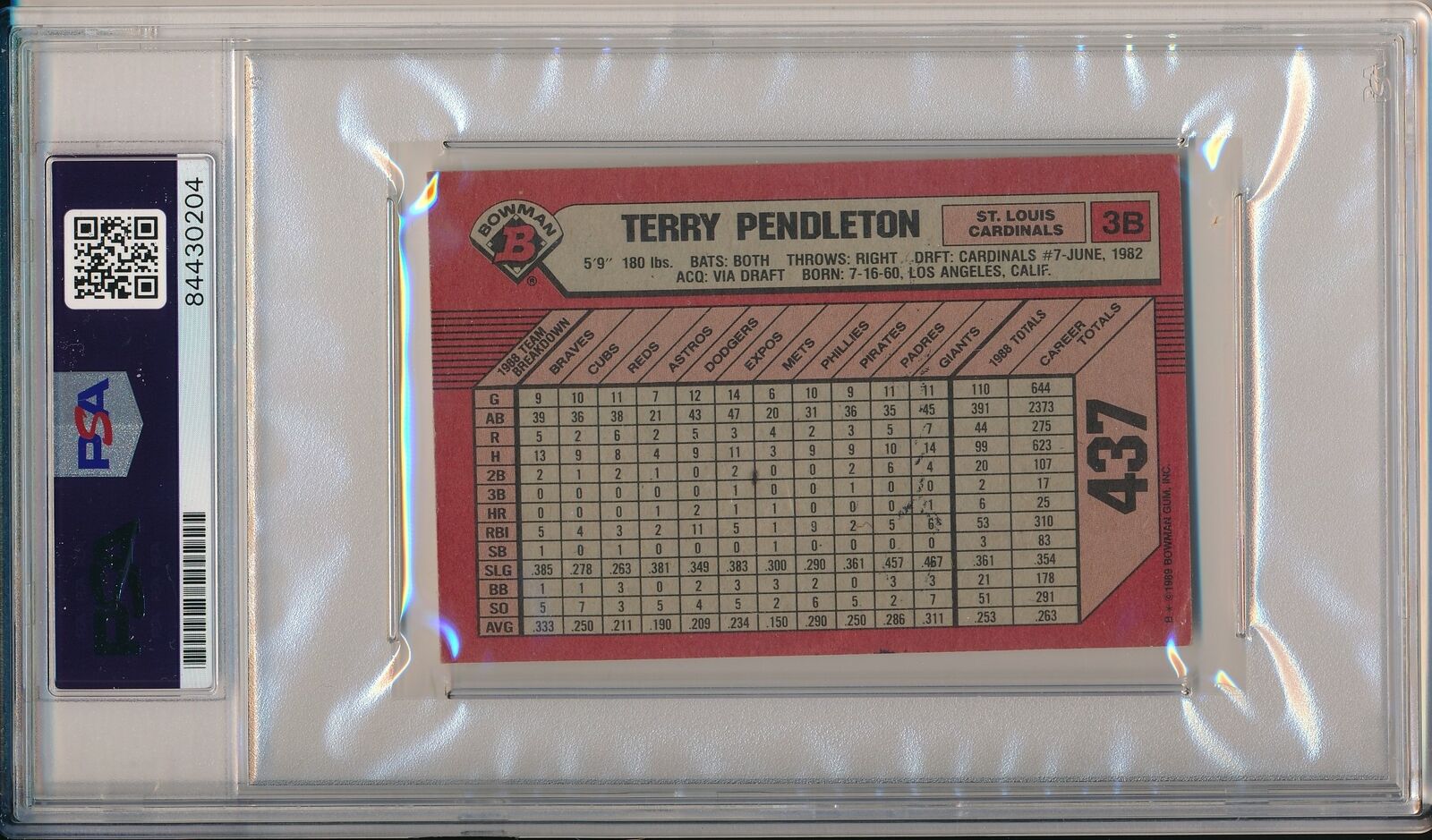 Terry Pendleton Cardinals Signed/Auto 1989 Bowman Card #437 PSA/DNA 164548